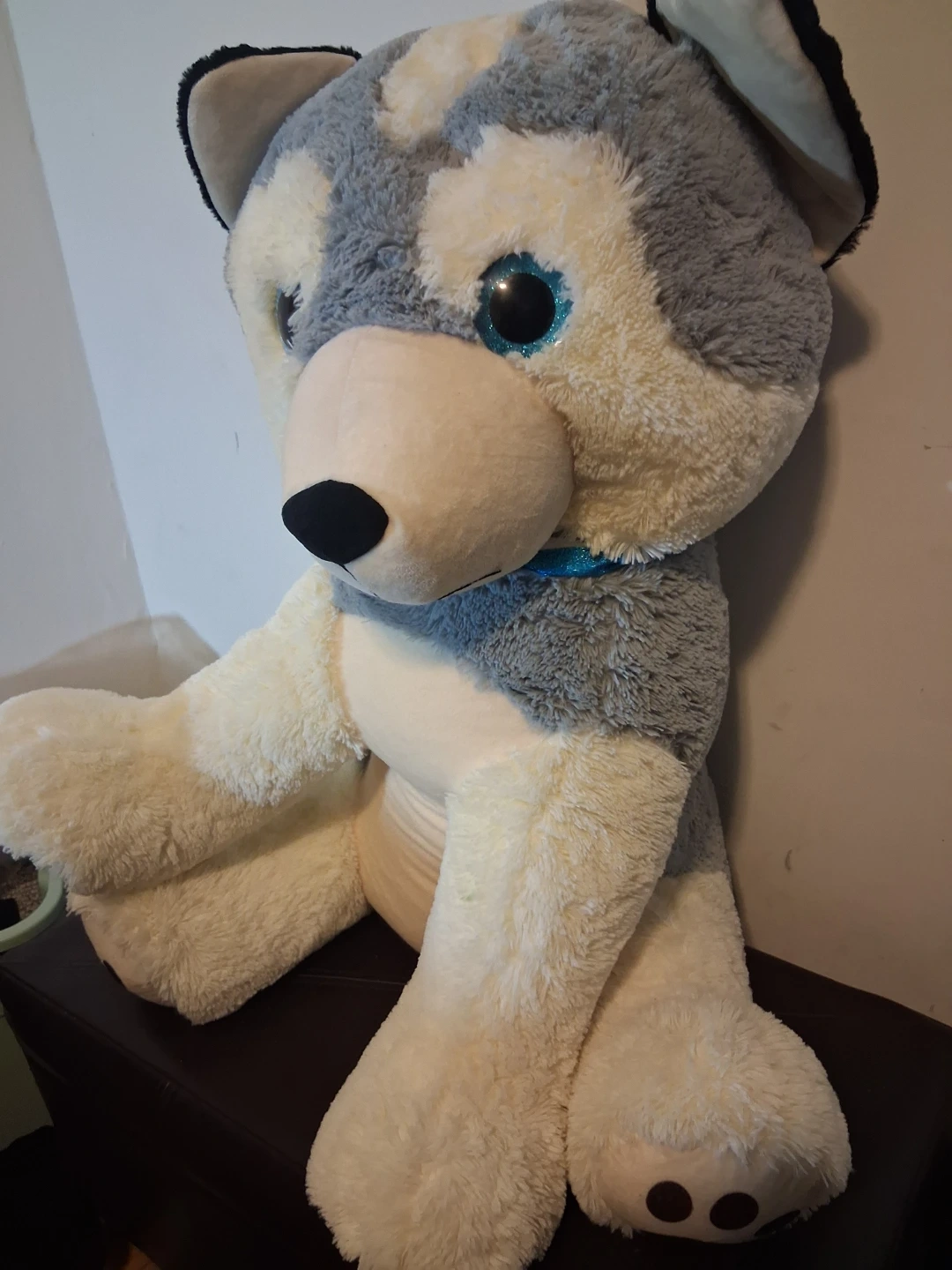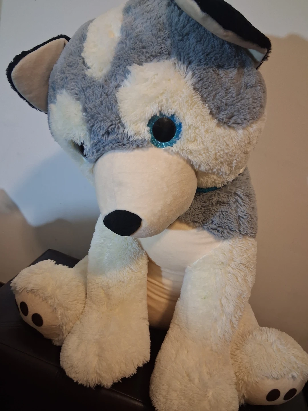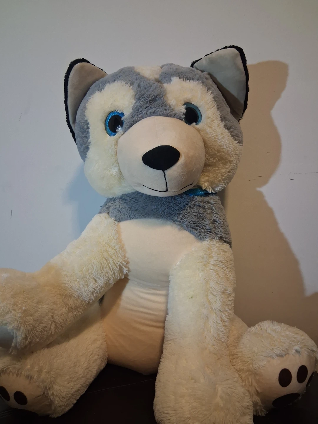 This is a large, soft plush husky dog stuffed animal. It's got blue glittery eyes and a blue collar. It's super huggable! Medidas aprox , alto 85 cm Ancho 40 cm