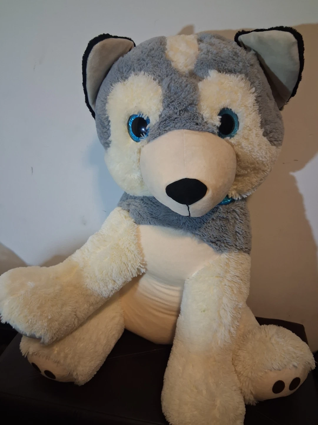 This is a large, soft plush husky dog stuffed animal. It's got blue glittery eyes and a blue collar. It's super huggable! Medidas aprox , alto 85 cm Ancho 40 cm