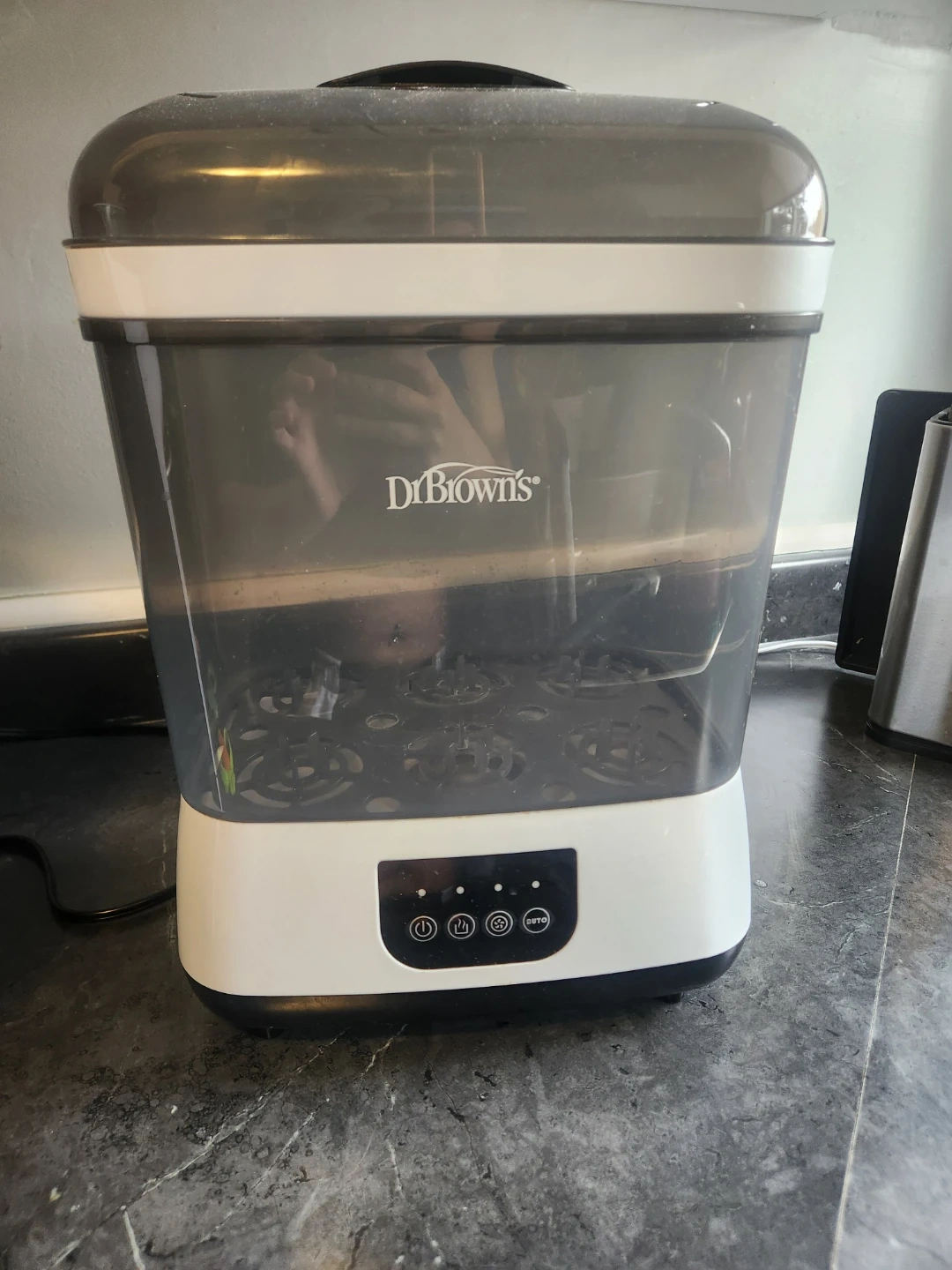 Dr. Brown's sterilizer with multiple components included. This unit helps sanitize baby bottles and accessories. Upper tray is perfect for small parts. Very user friendly.