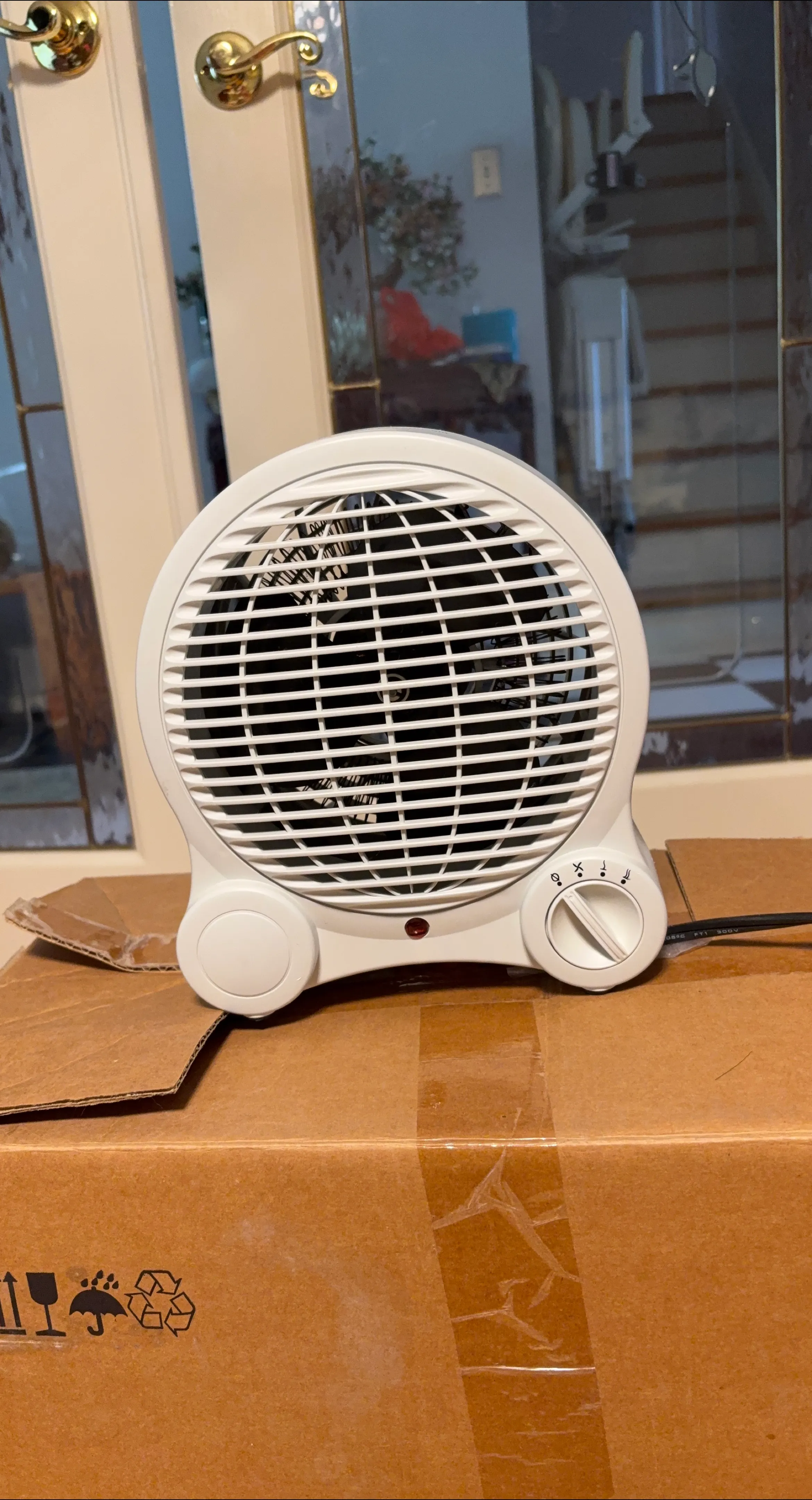 Off white,rounded heater. Includes a power indicator light and control dials. The heater is set on top of a cardboard box. It's perfect to cozy up next to on a cold day.