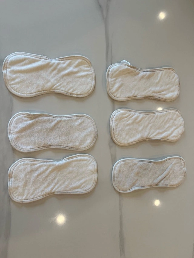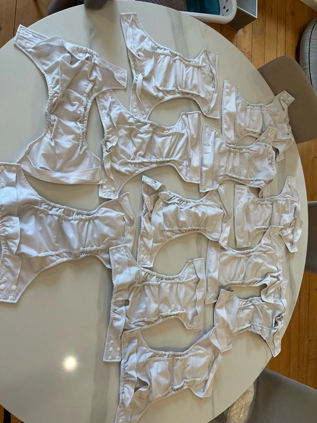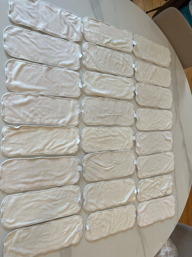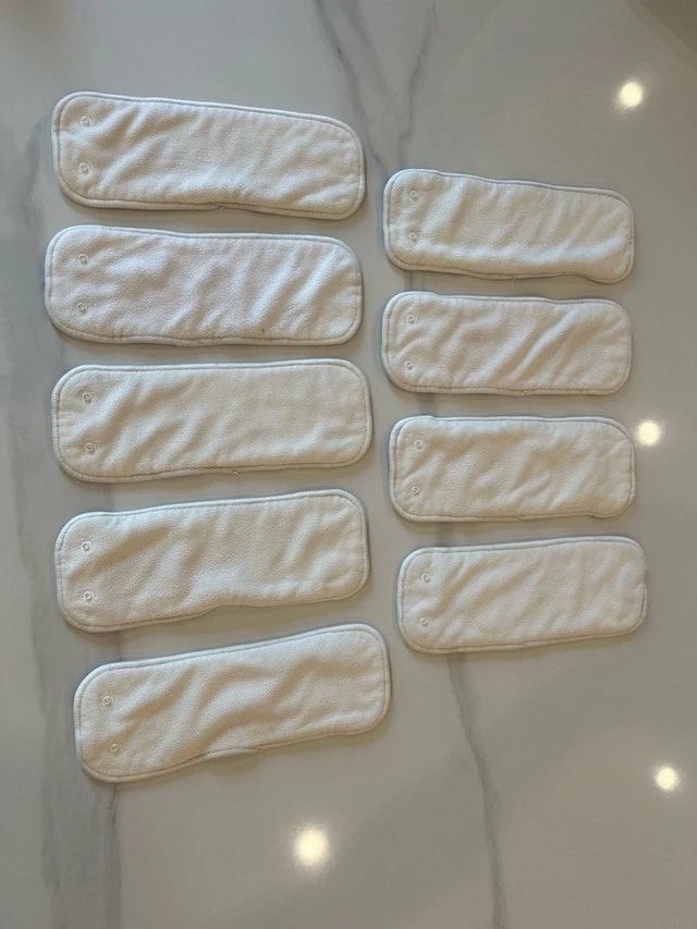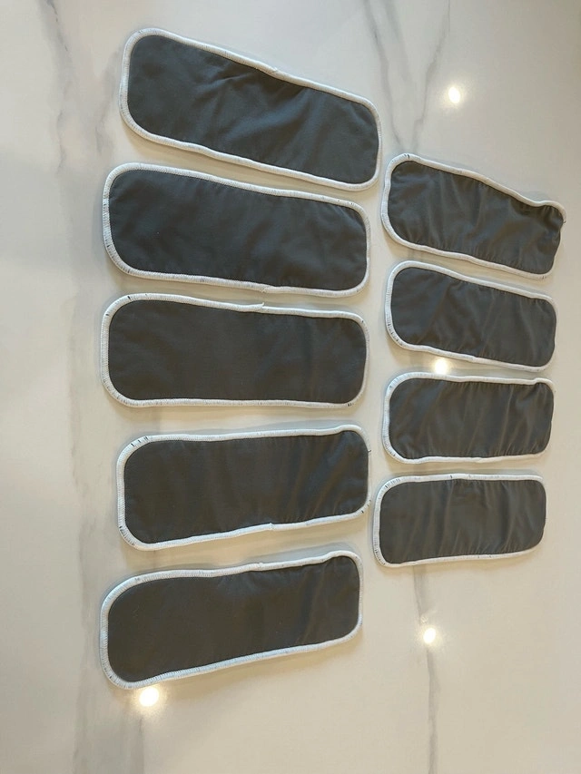 Machine washable, adjustable cloth diapers. Includes 12 Plain Shells, 9 Charcoal Shells with built-in pads, 24 Plain pads, 9 Charcoal pads, 6 Bonus Pads, and 10 Diaper Liners. Pictures show both sides of the diapers and pads. They are bleached and ready to use.