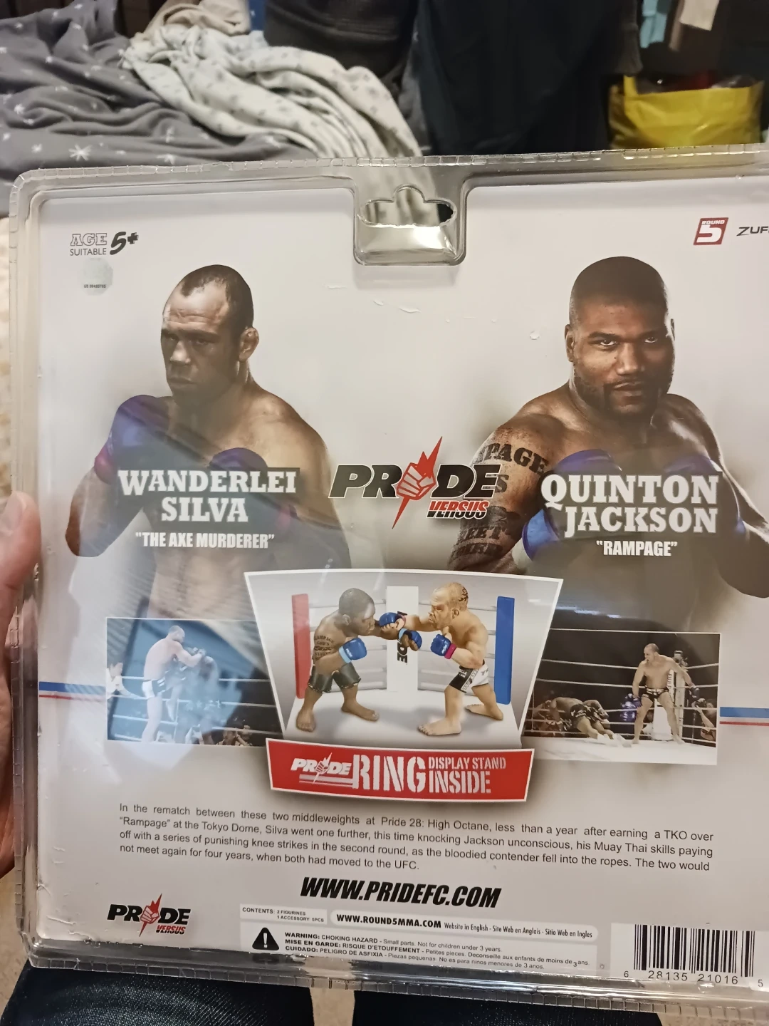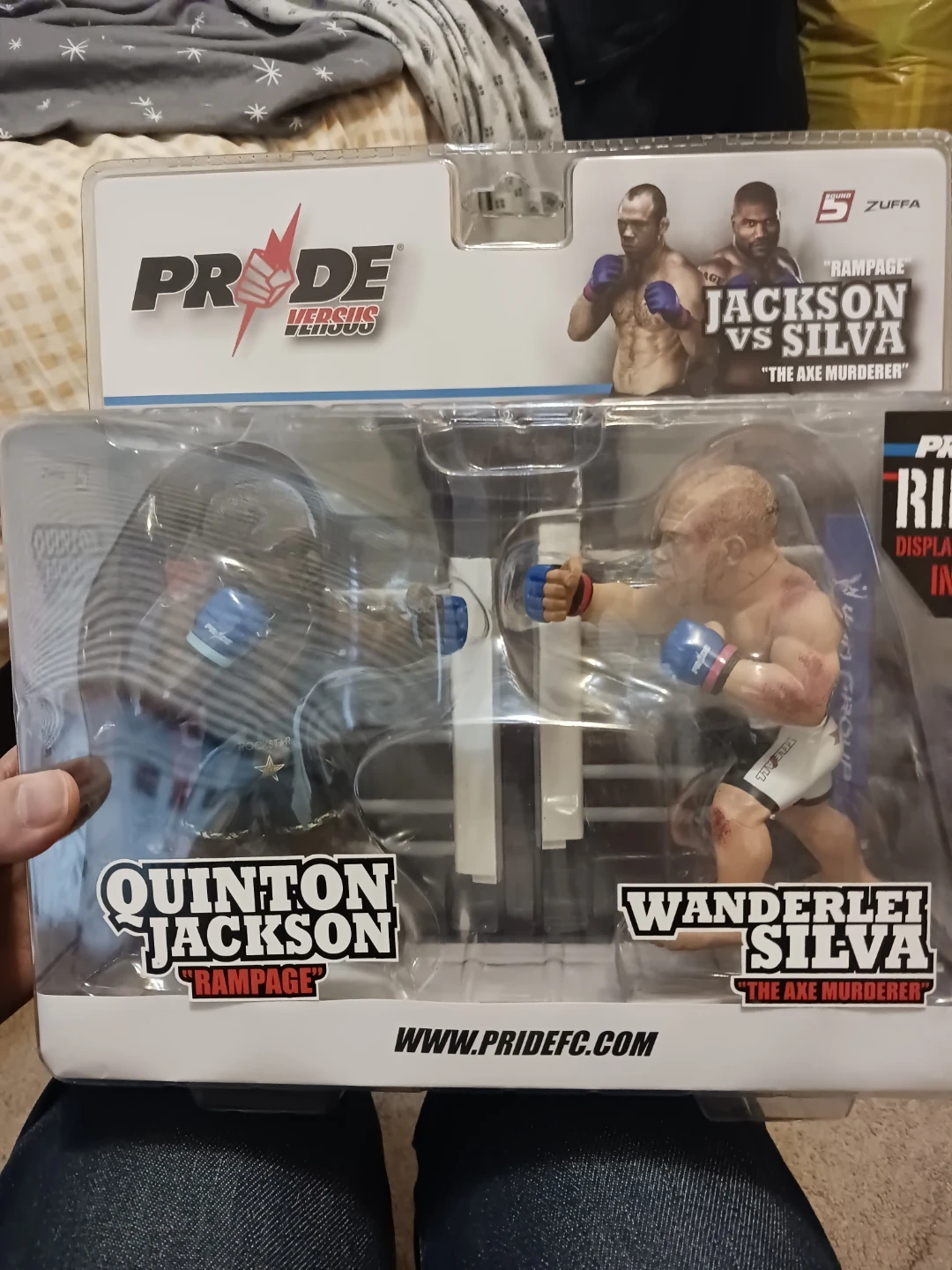 This is a PRIDE FC action figure set featuring Quinton Jackson "Rampage" and Wanderlei Silva "The Axe Murderer". It includes a display stand. Unopened