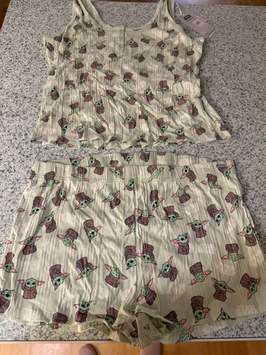 This light green pajama set features a Star Wars Mandalorian print with Baby Yoda. It's a size XL, made in India, and includes a tank top and shorts. Great for fans of the show!
