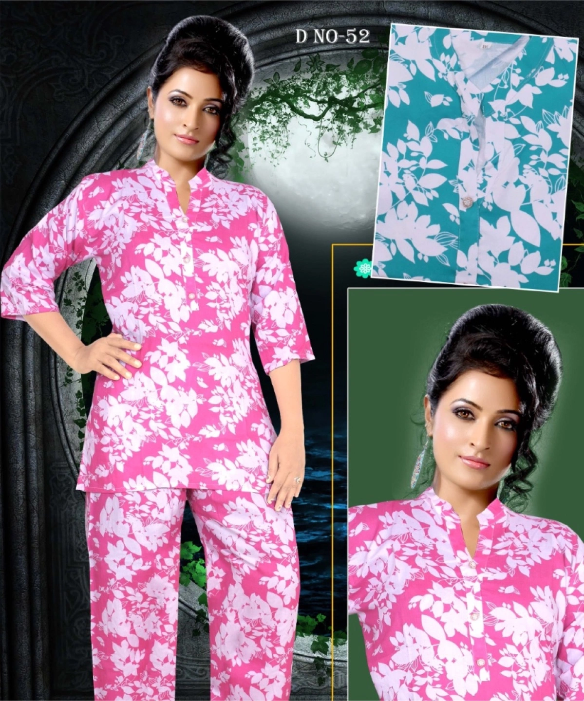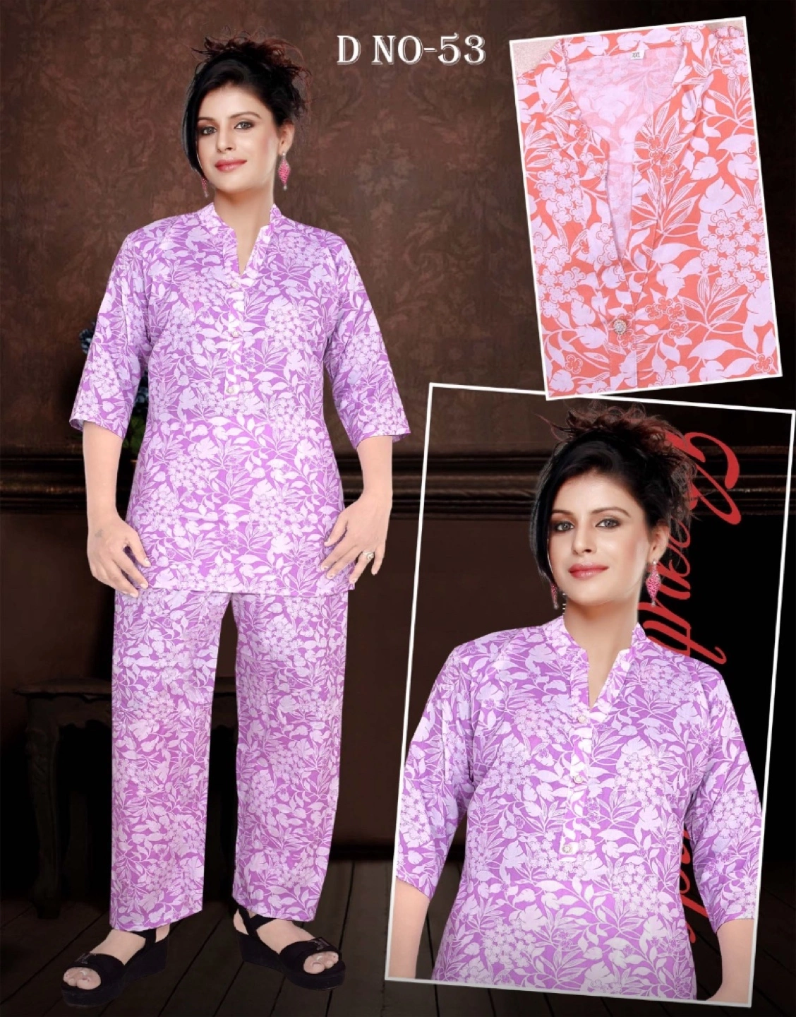 Matching pajama set, with a floral design. Features a top with a collar and three-quarter sleeves, and matching pants. Perfect for relaxing on the weekends.