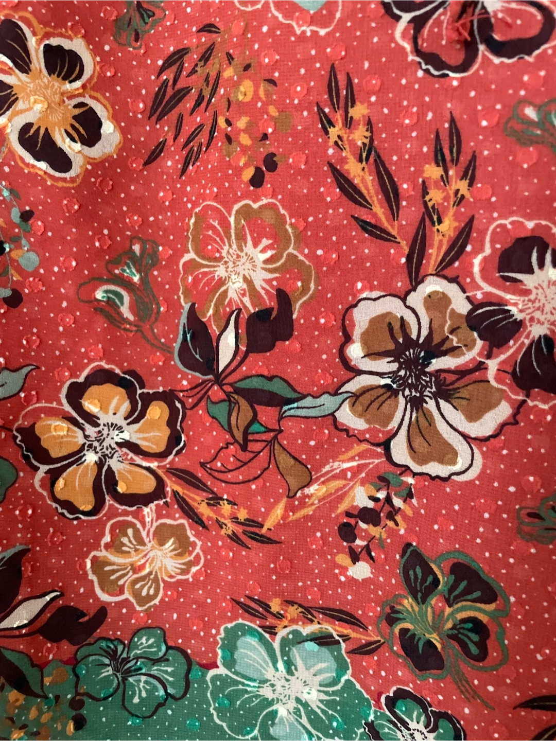 This Maison d'Amélie long-sleeve blouse features a vibrant all-over floral print on a red background. It has a ruffled mock neck with a tie closure and a decorative green border at the hem. Sheer fabric with a slightly textured pattern. Size XS. Brand New never worn.
