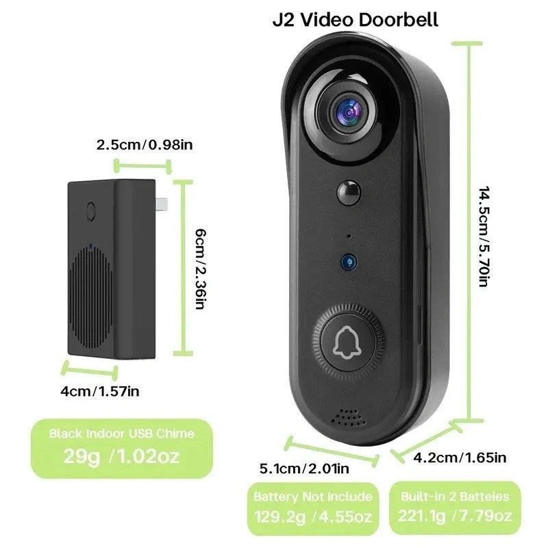 This J2 video doorbell camera comes with a black indoor USB chime and a 32GB micro SD card for storage. It features motion detection and two-way audio. The doorbell itself is 14.5cm long and 4.2cm wide. Battery not included.