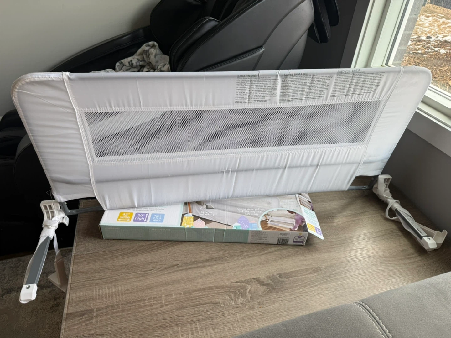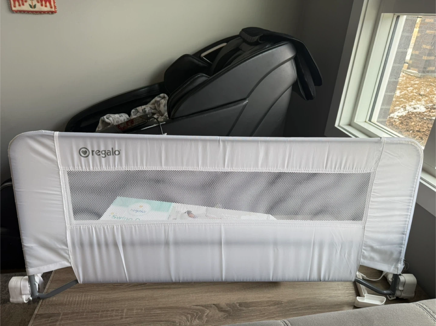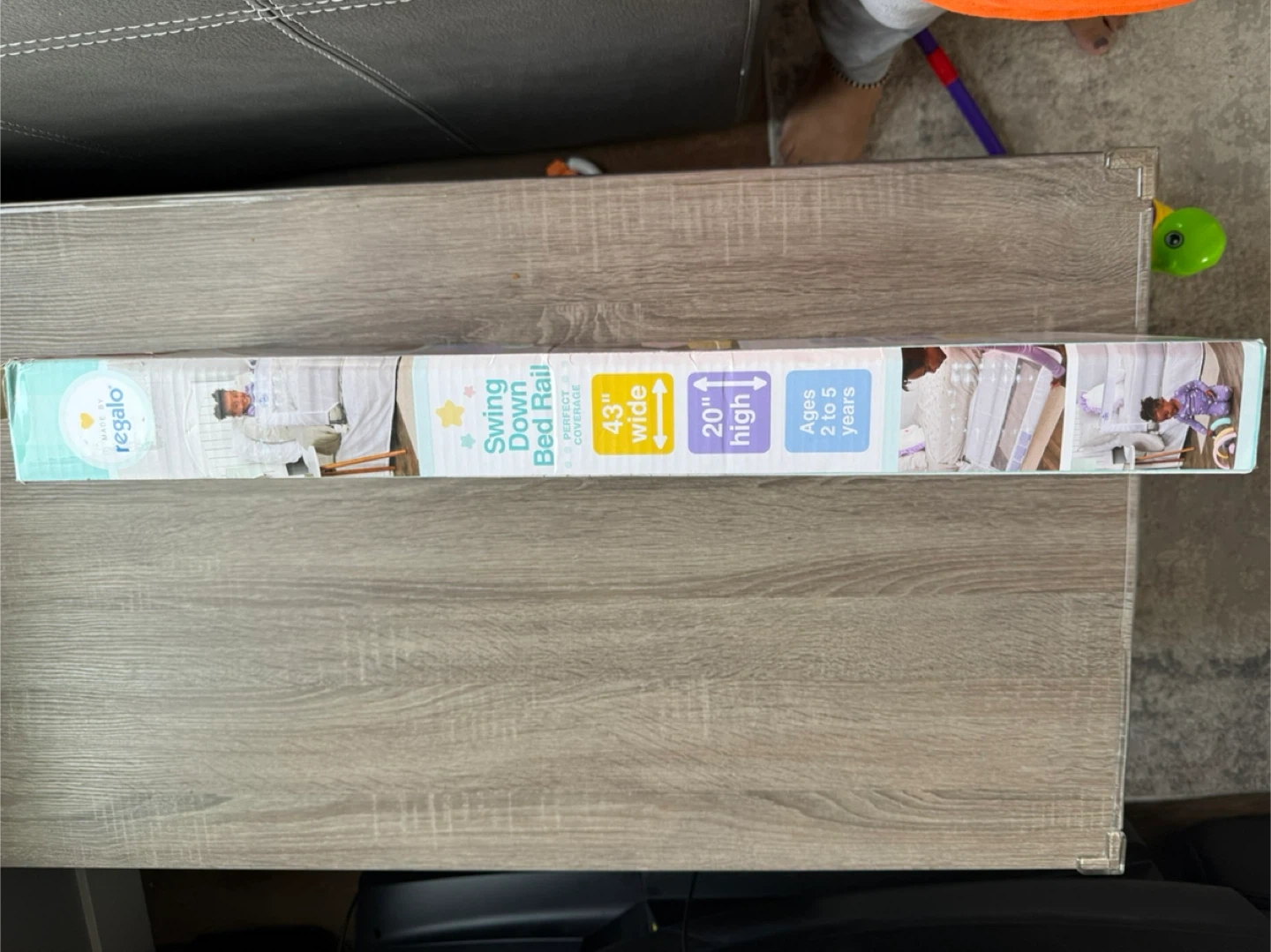 Handy Regalo swing down bed rail. This white bed rail is 43 inches wide and 20 inches high. Good for kids ages 2 to 5 years. Easy no tool set-up. Swings down and out of the way when not in use. Perfect length for all beds.
