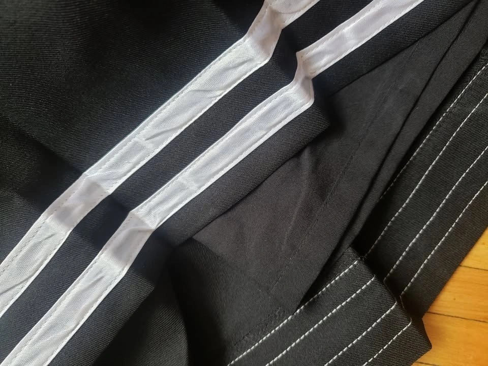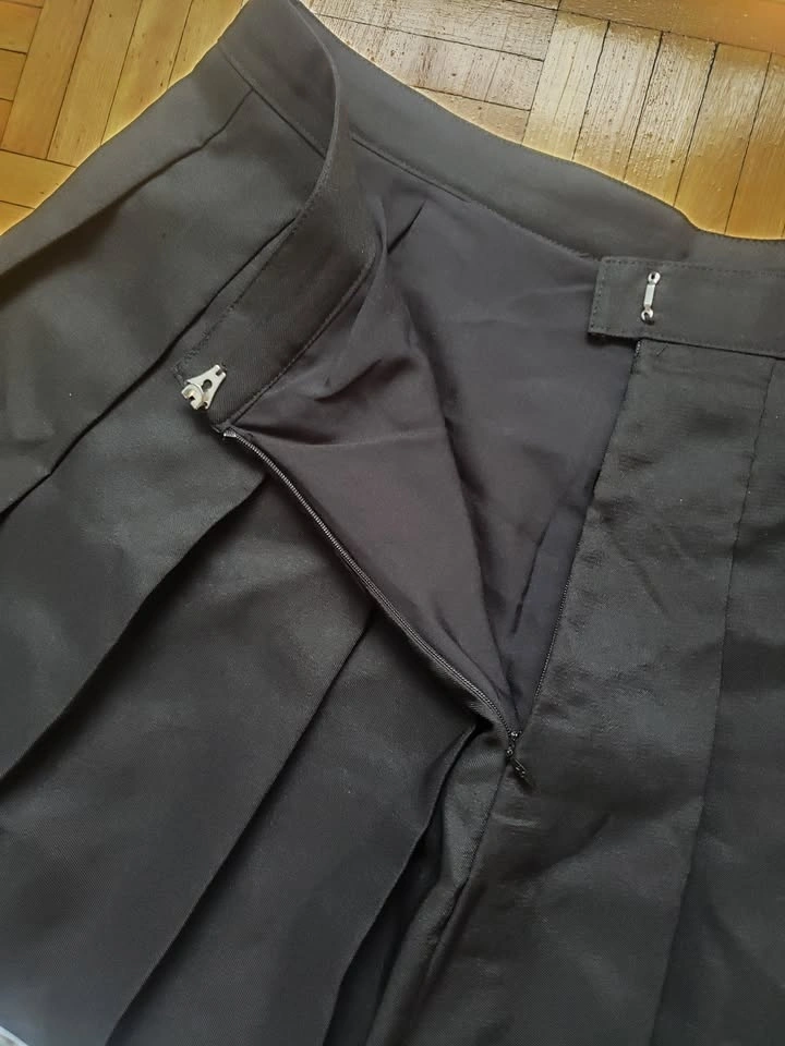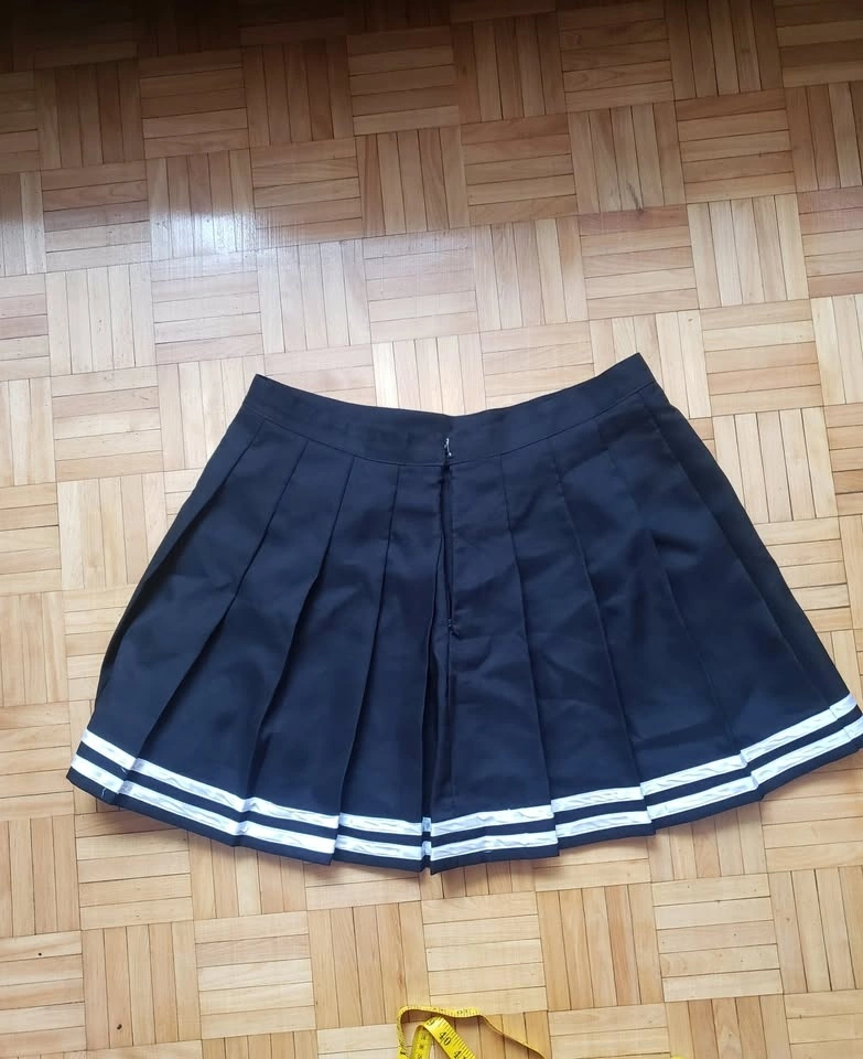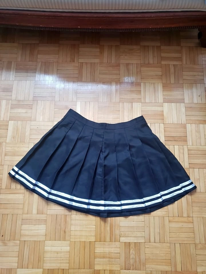 Glitters for Dinner pleated cheer/mini tennis skirt. Black with two white stripes. Features a 7” zip and hook closure in the back. Size 3XL, but will fit smaller. Length: 18", Waist: 18" (36" around). Bundle and save! Pick up near Queen and John.