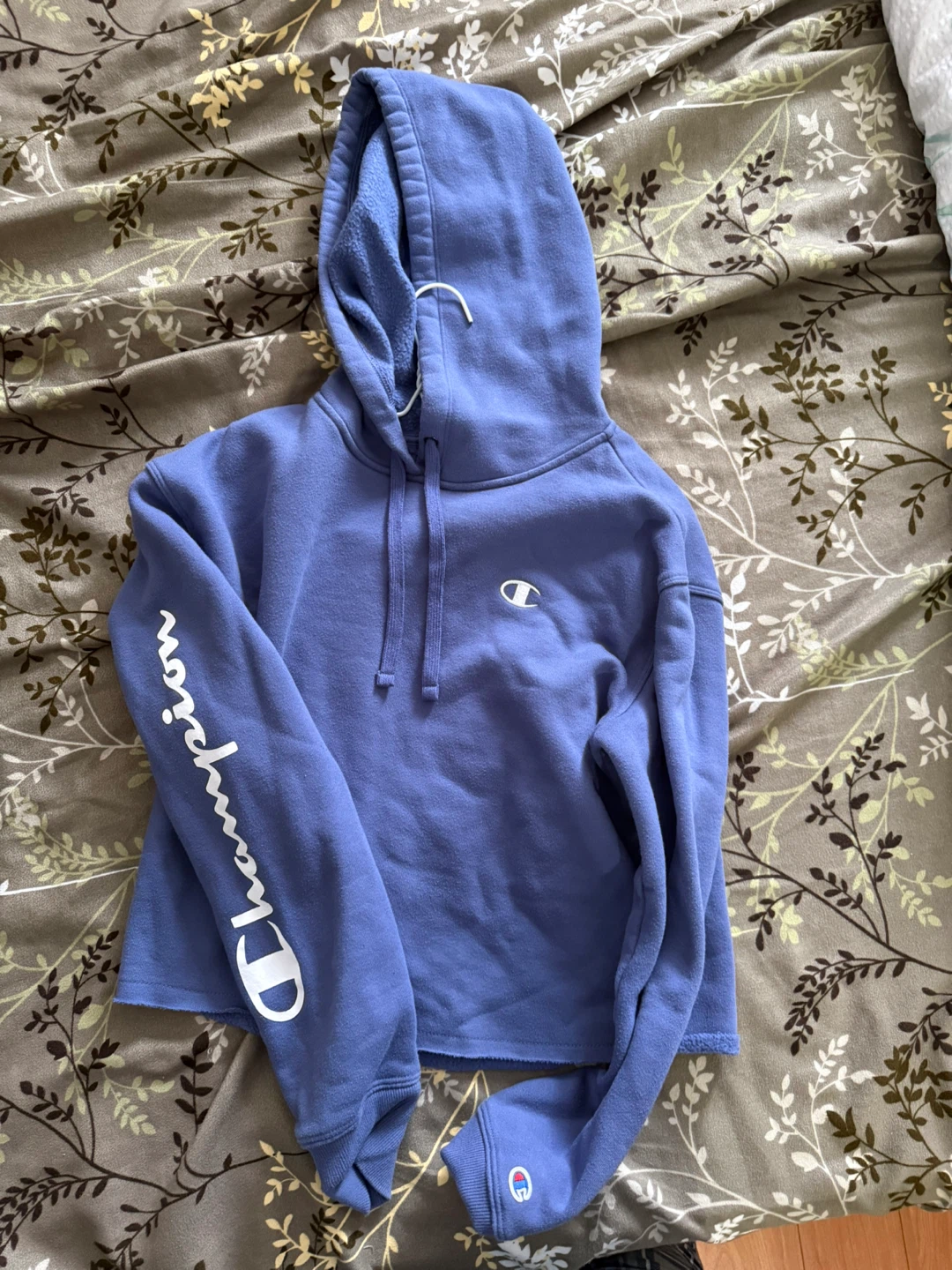 A cute blue Champion hoodie! It's in great condition. The Champion logo is on the left sleeve and the chest. Perfect for staying cozy on cooler days. Size is xs or small