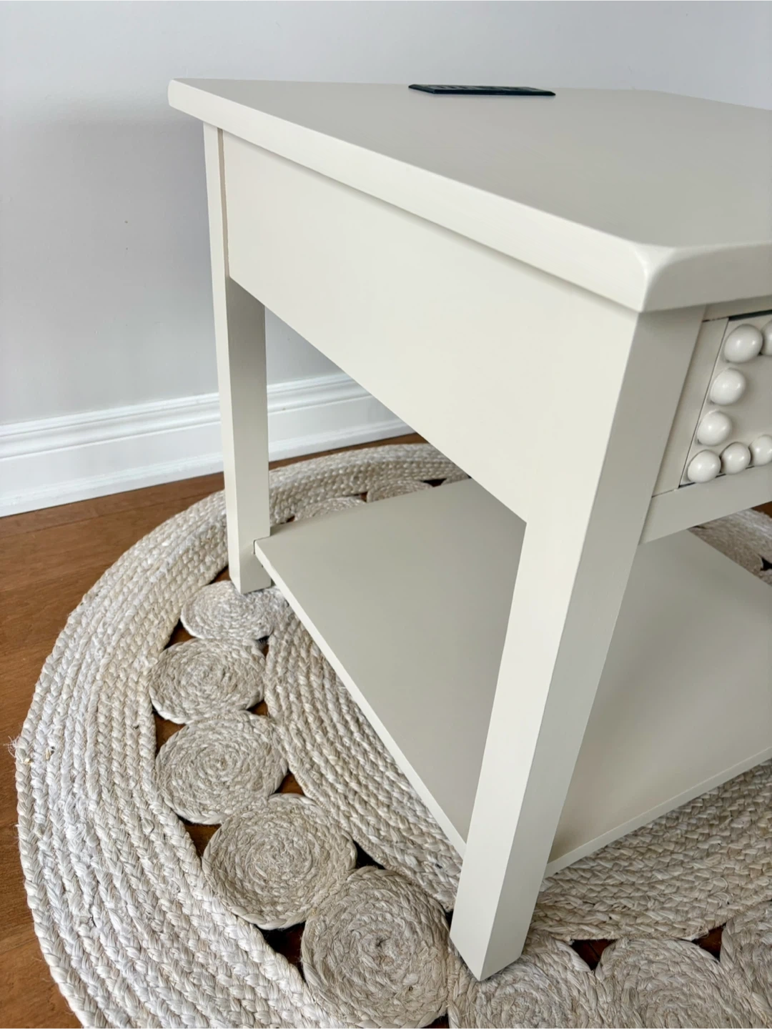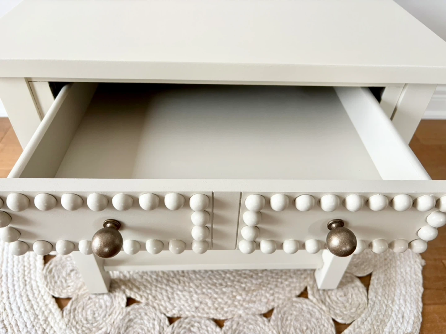 Large, solid wood end tables finished in a soft neutral “sandbar” shade that compliemnts any existing colour palette seamlessly. Despite the neutral colour, the decorative wood round detailing and large brass drawer knobs make these true statement pieces.