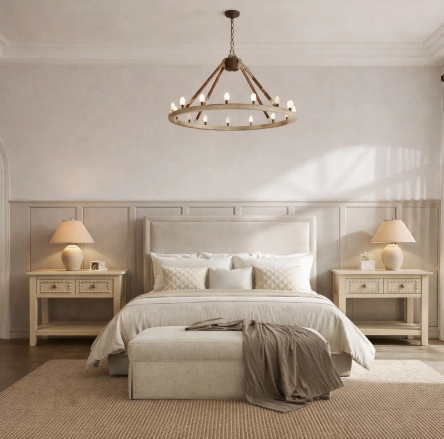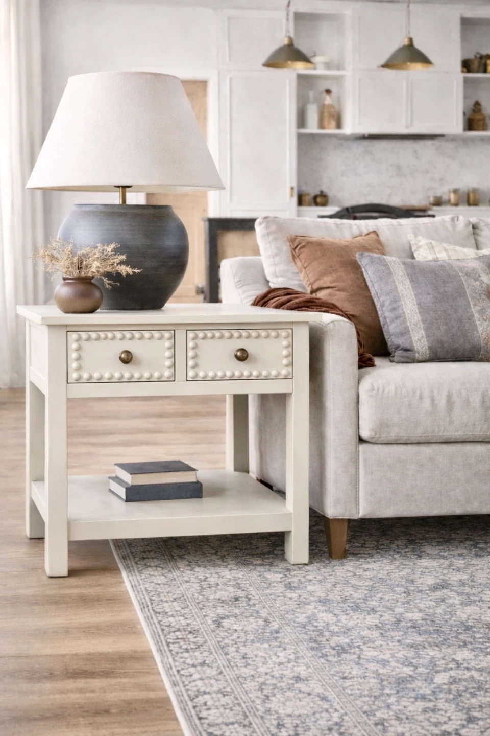 Large, solid wood end tables finished in a soft neutral “sandbar” shade that compliemnts any existing colour palette seamlessly. Despite the neutral colour, the decorative wood round detailing and large brass drawer knobs make these true statement pieces.