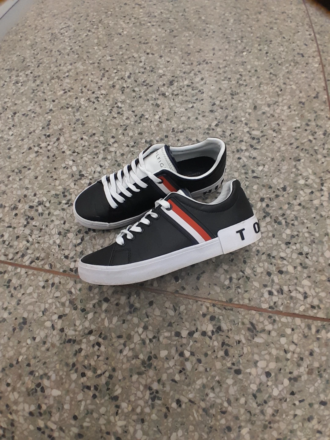 Tommy Hilfiger sneakers with white laces and signature red and blue stripe detail. They have a comfortable low-top design and a durable rubber sole. These sneakers are great for everyday wear and casual outings! Men's size 7