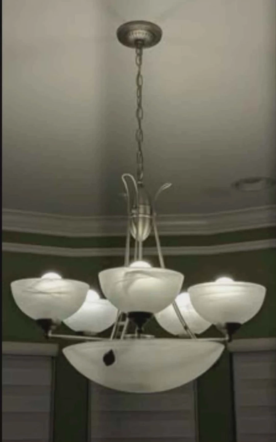 This elegant chandelier features a chain for hanging and five frosted glass light shades. It's a lovely centrepiece for any dining room or entryway. The metal accents are a brushed nickel finish. Can accommodate 8 lightbulbs. 5 are included