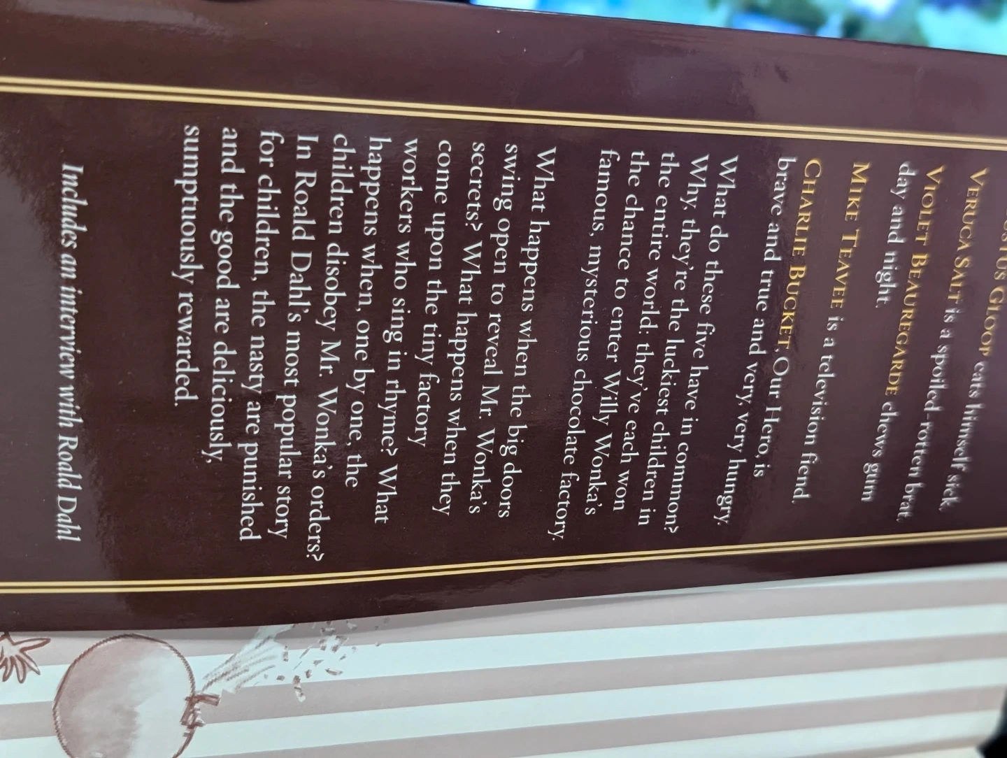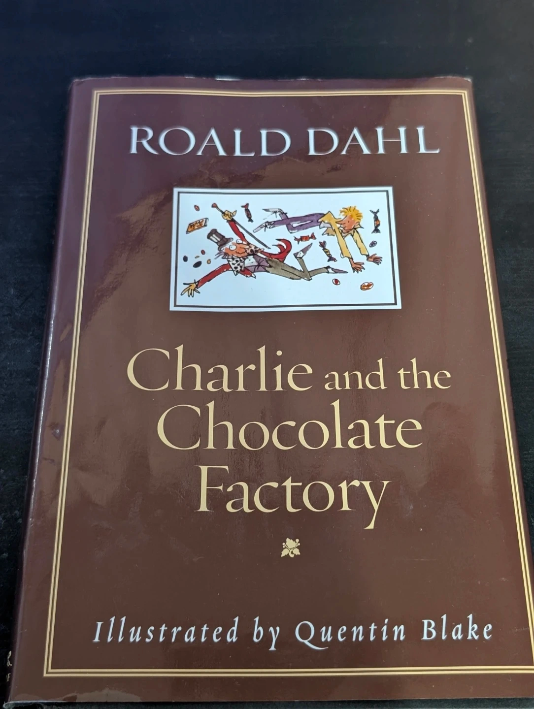 Selling a vintage copy of Charlie and the Chocolate Factory by Roald Dahl! It's a classic children's book illustrated by Quentin Blake. Includes an interview with Roald Dahl on the back