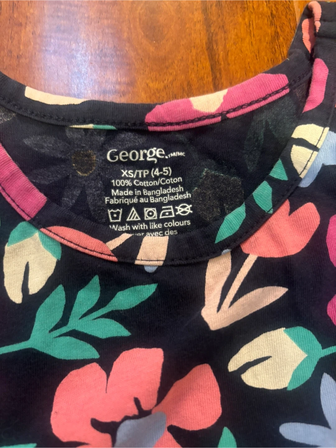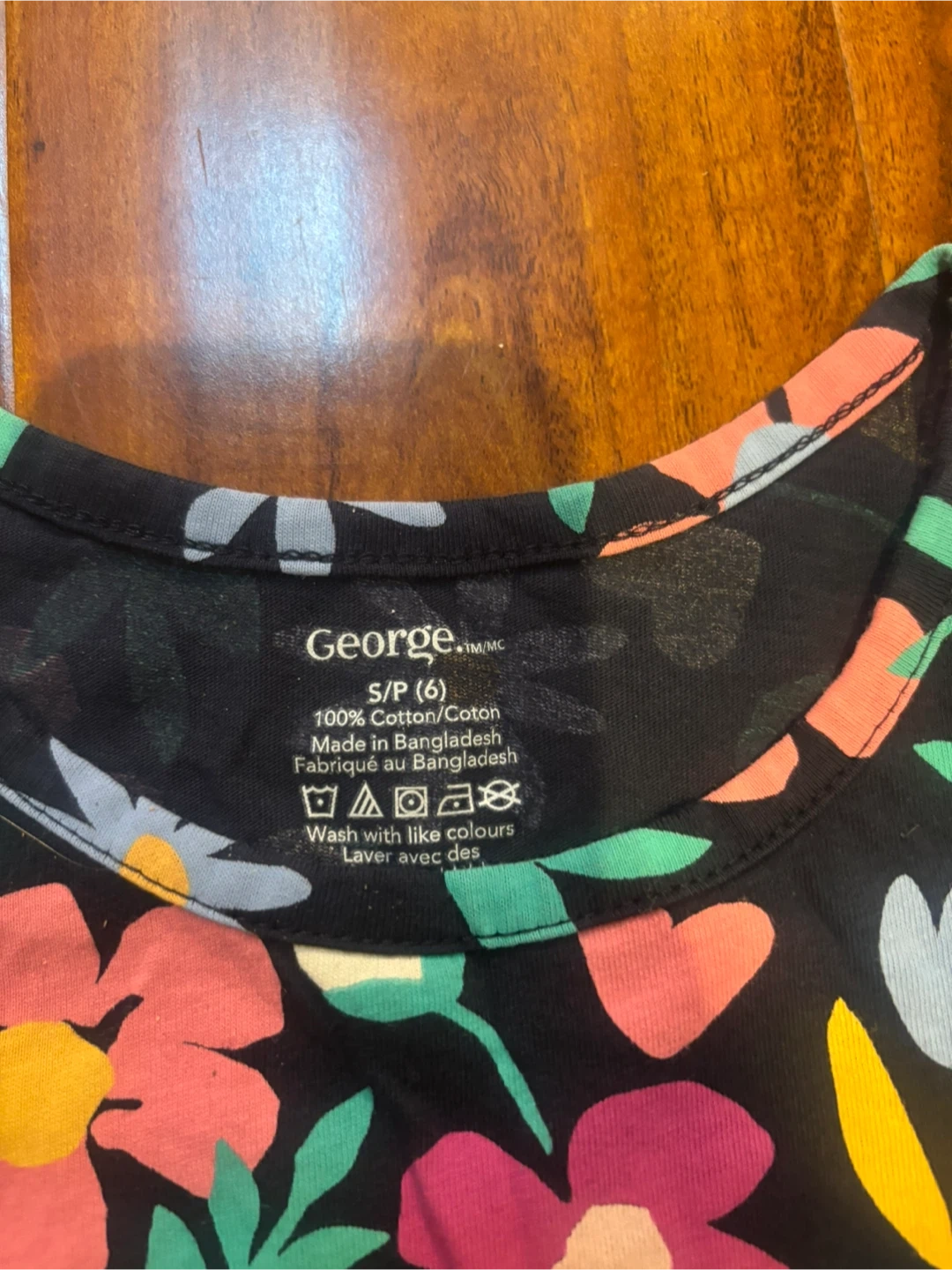 Matching George brand dresses with a colourful floral print on black fabric. Both are made of 100% cotton. One is size S/P (6) and the other is size XS/TP (4-5).