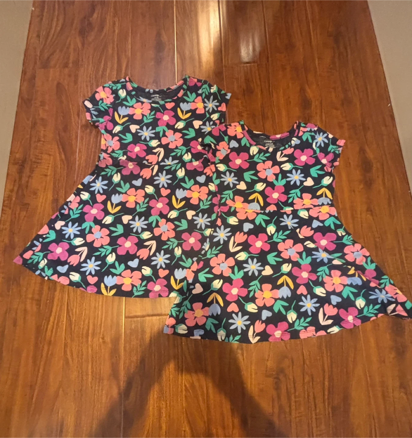 Matching George brand dresses with a colourful floral print on black fabric. Both are made of 100% cotton. One is size S/P (6) and the other is size XS/TP (4-5).