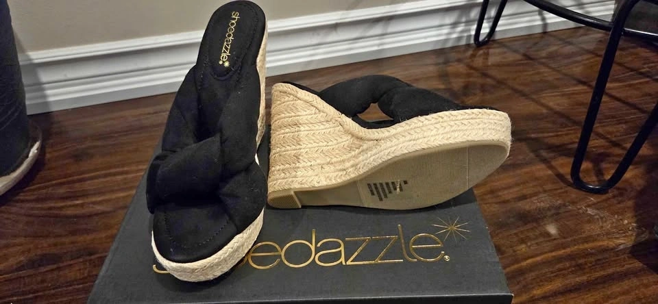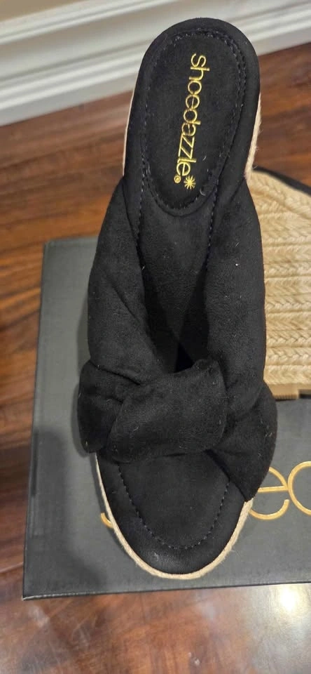 Cute Shoedazzle black espadrille wedge sandals with a knotted strap detail. Slip on, easy to wear. Espadrille wedge for a summer look. Super clean and never used, brand new in box.