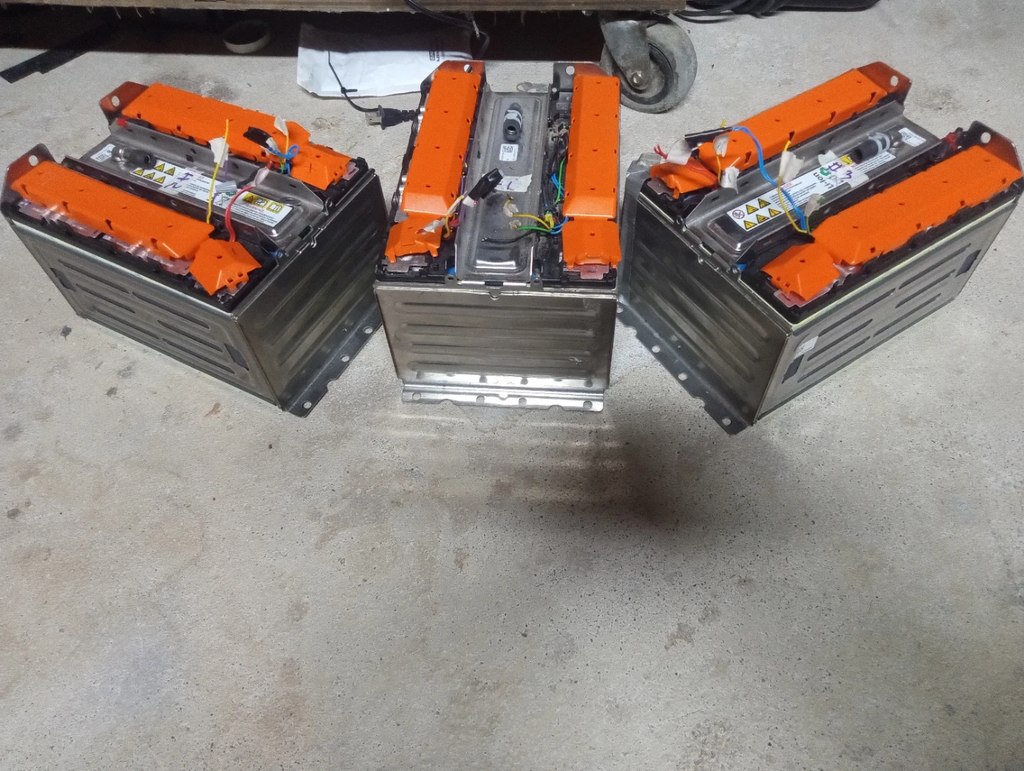 Three electric vehicle battery modules. These units are designed for high-performance applications. They feature robust construction and advanced battery technology.