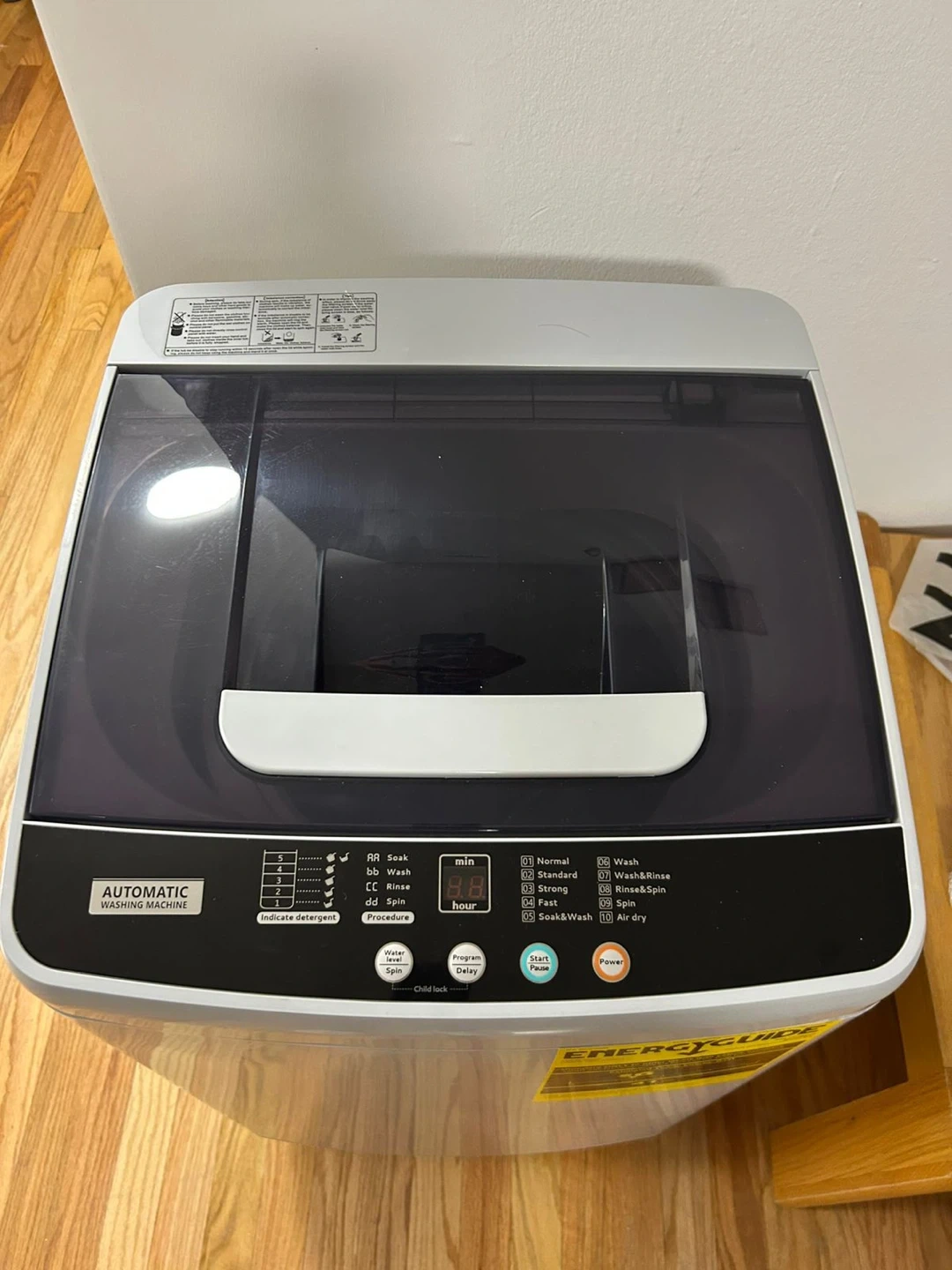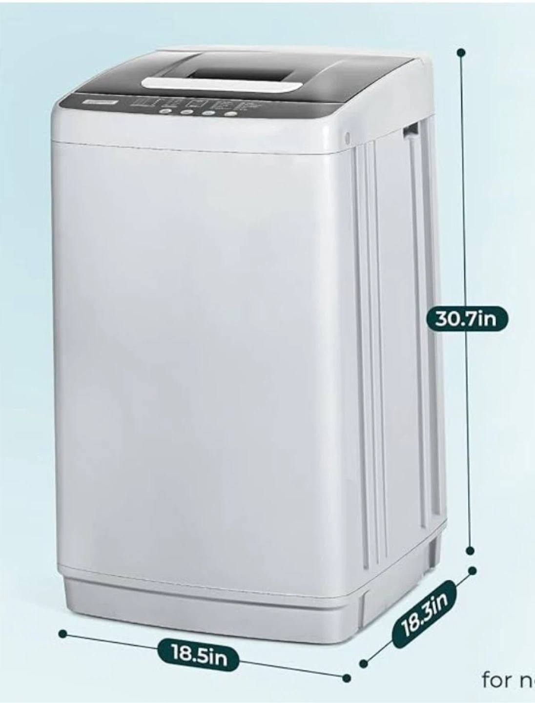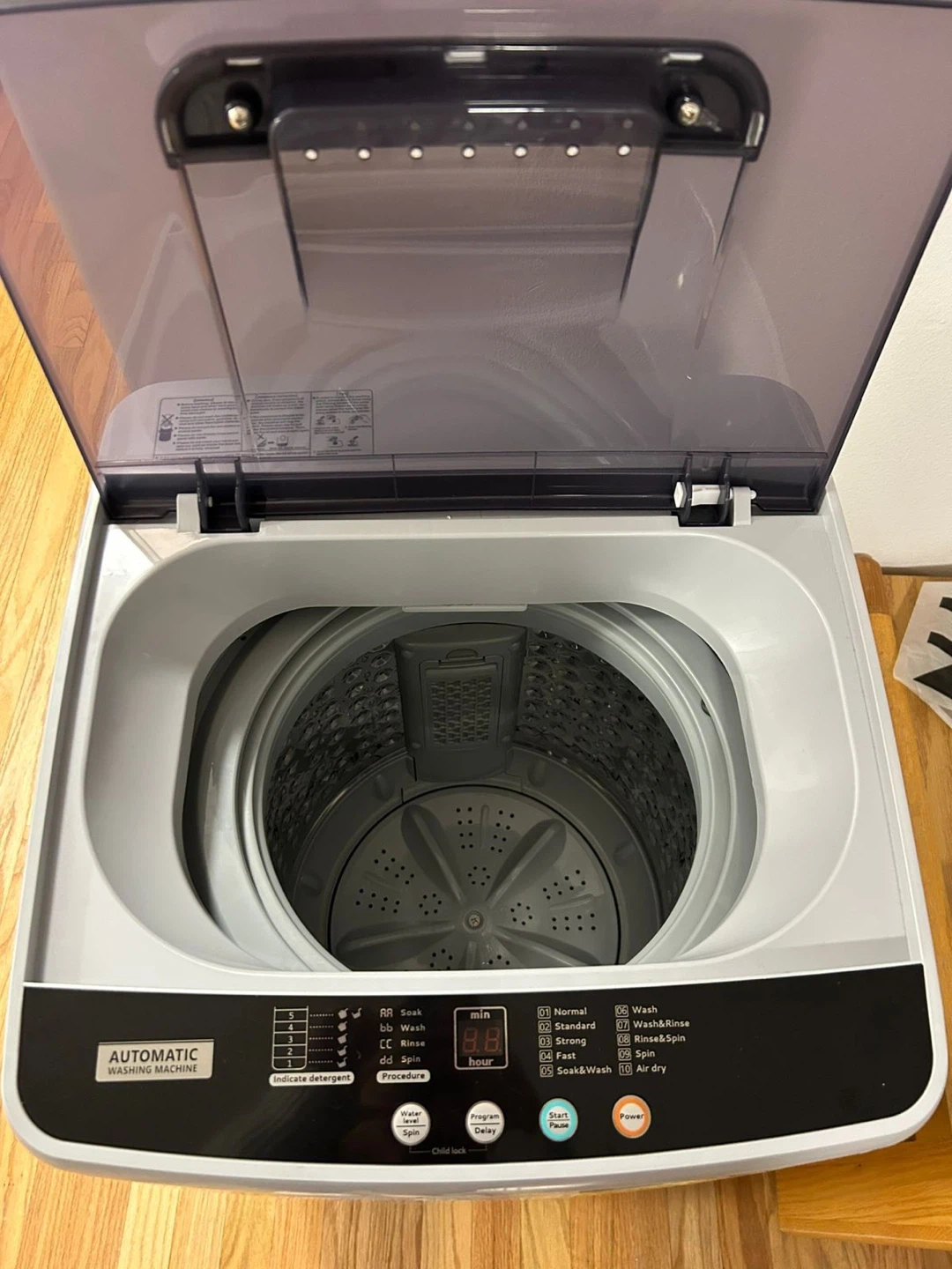 Automatic portable washing machine with 8.8 lbs capacity and multiple wash cycles including Normal, Strong, Quick, Soak, Rinse, Wash & Rinse, Rinse & Spin, and Air Dry. 5 water leves. It has a digital display for time and a child lock feature. Dimensions are 18.5in (W) x 18.3in (D) x 30.7in (H).