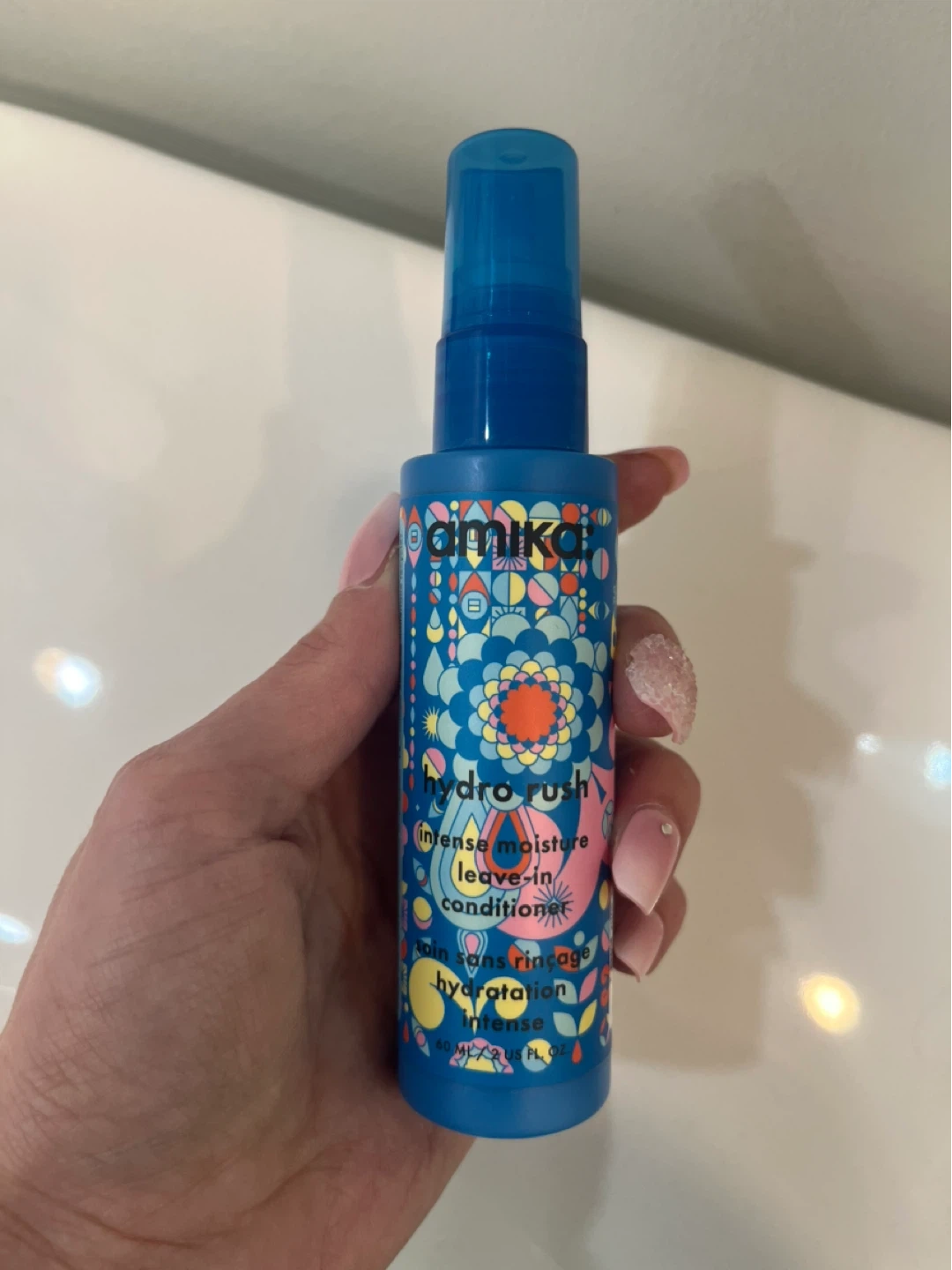 NEW Amika Hydro Rush intense moisture leave-in conditioner. It's a 60ml bottle. This product provides intense hydration for your hair.