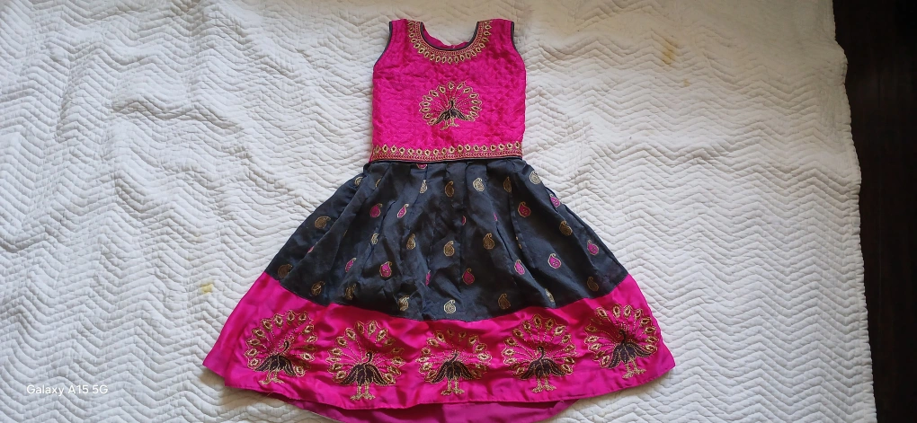 3 frocks 10$ Three beautiful girls' dresses. One blue and gold Pattu Pavadai. One pink and grey Pattu Pavadai with peacock embroidery. One light pink tulle dress with rose embellishments. Suitable for special occasions. Gently used, excellent condition.