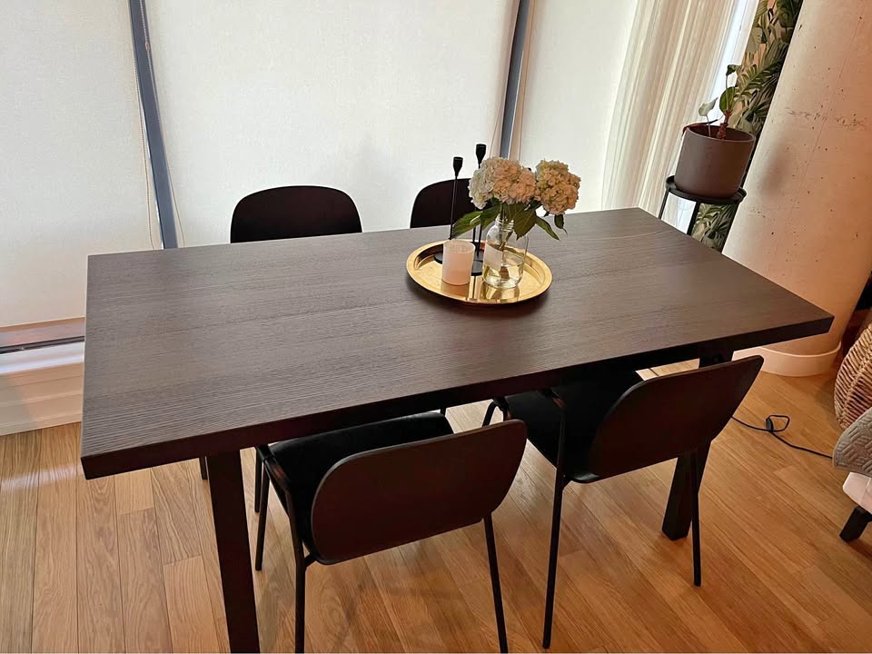 Sturdy Ikea wood dining table with four chairs. Seats up to six people. Removable legs for easy transport. Excellent condition, minor nicks. Dimensions: 67" x 30.75" x 29.5" (170cm x 78cm x 75cm).