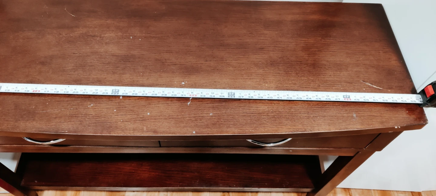 This dark brown console table has two drawers with silver handles. It features a lower shelf for extra storage. The table is approximately 30 inches tall and 55 inches long. It's made of wood.