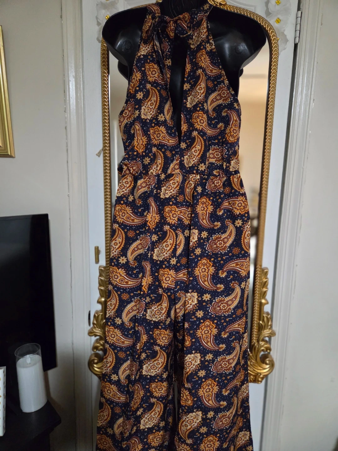 This jumpsuit features a halter neck and a stylish paisley print. It's perfect for a casual or dressy occasion. The material is lightweight and comfortable, making it ideal for warmer weather. It's in great condition and ready for a new home!