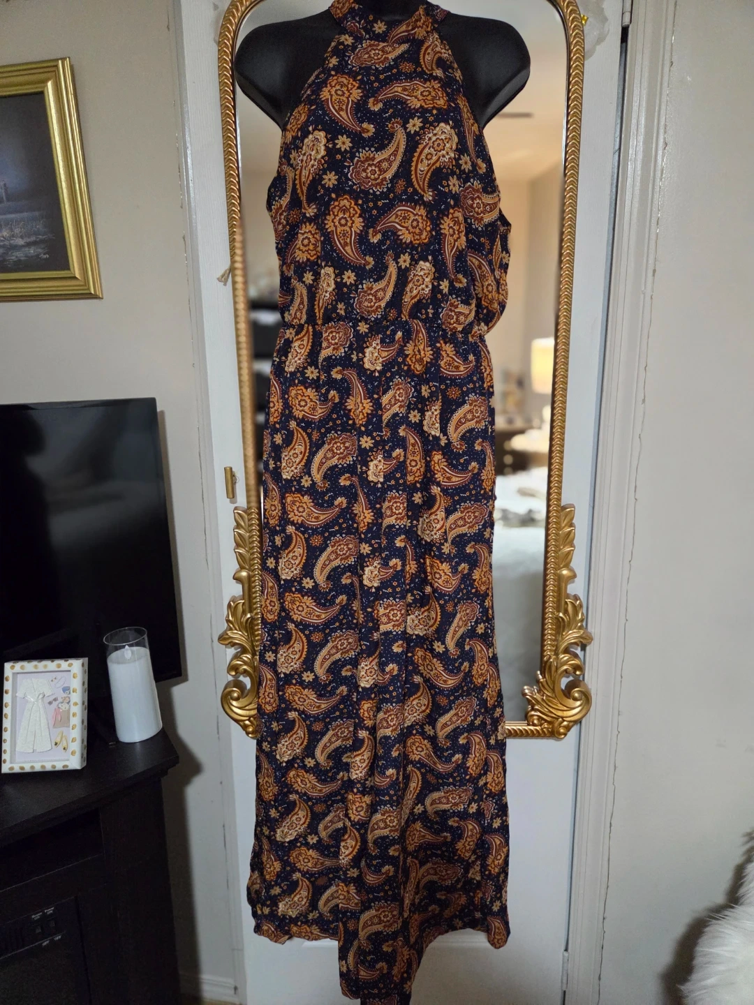 This jumpsuit features a halter neck and a stylish paisley print. It's perfect for a casual or dressy occasion. The material is lightweight and comfortable, making it ideal for warmer weather. It's in great condition and ready for a new home!