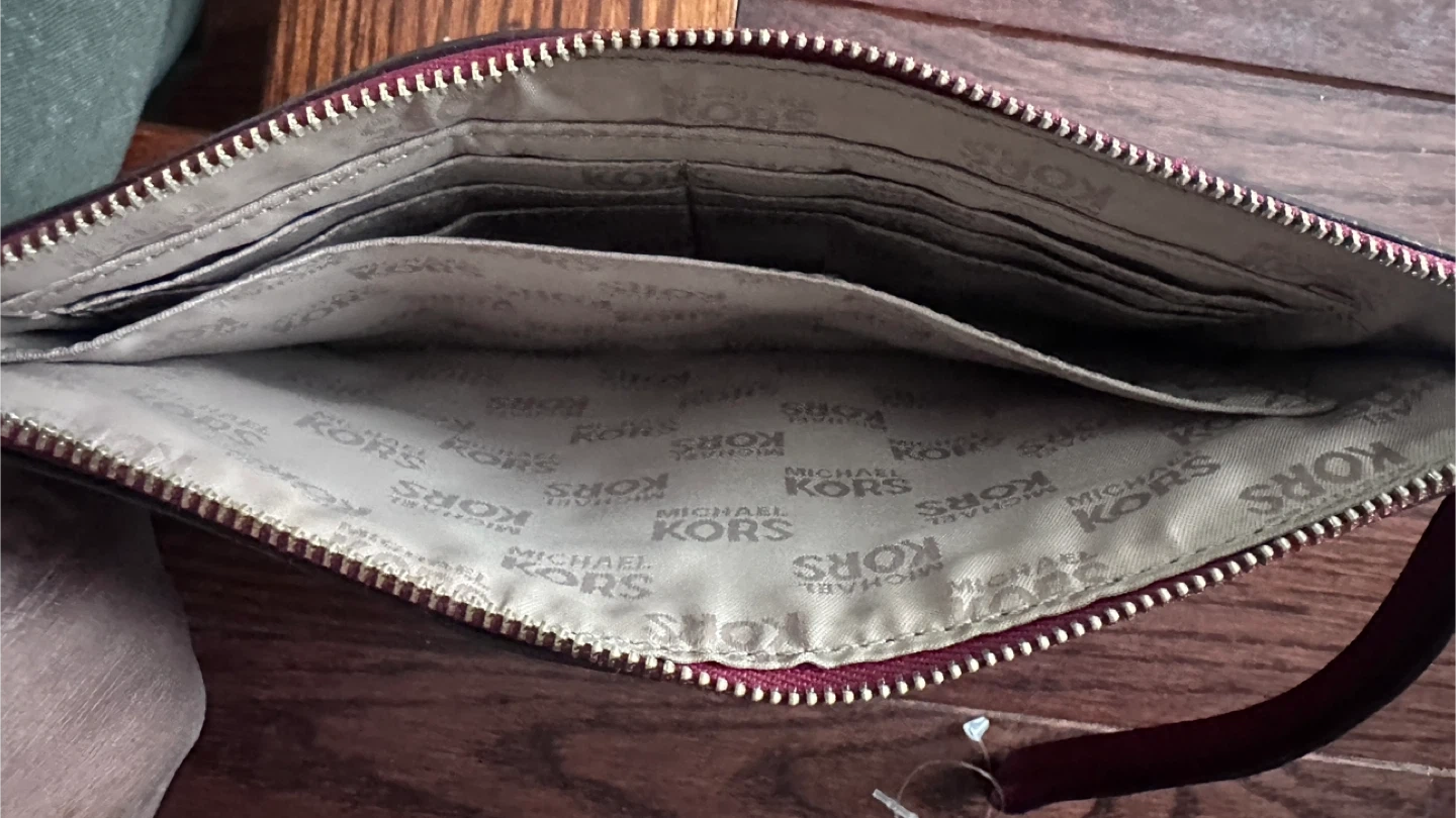 Michael Kors studded clutch in a burgundy colour. It's made with textured leather and has gold-tone hardware. Inside, it has card slots and a zippered compartment.