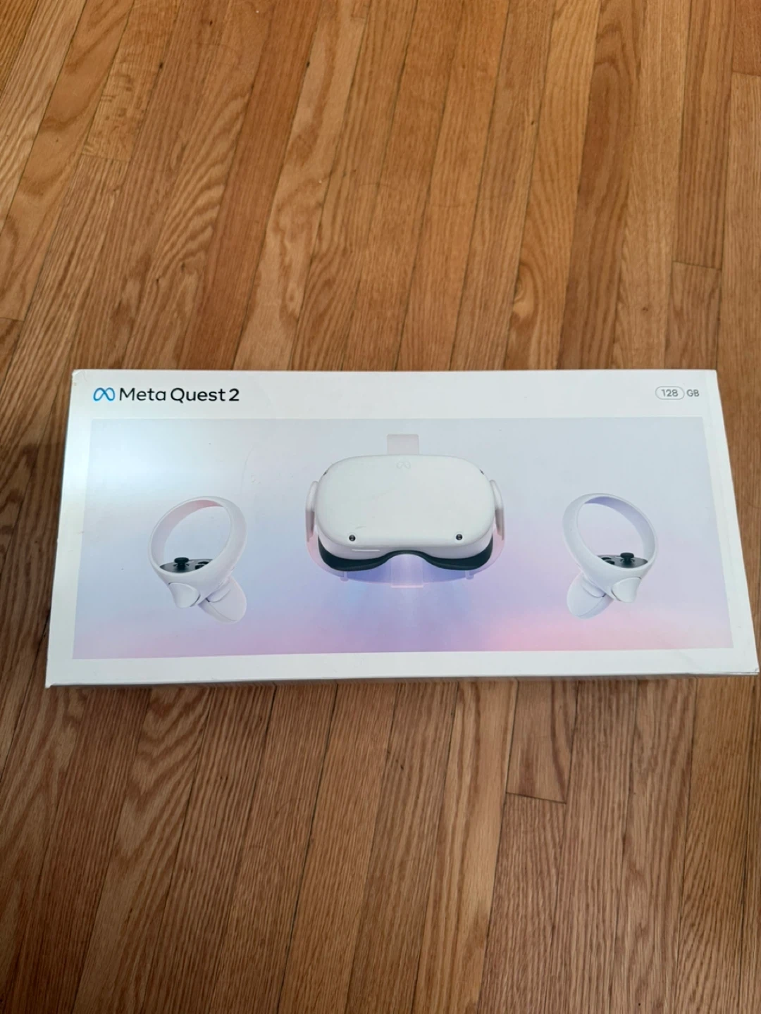 Meta Quest 2 virtual reality headset with 128 GB storage. It comes with two controllers and is in its original box. This headset offers an immersive gaming and entertainment experience.