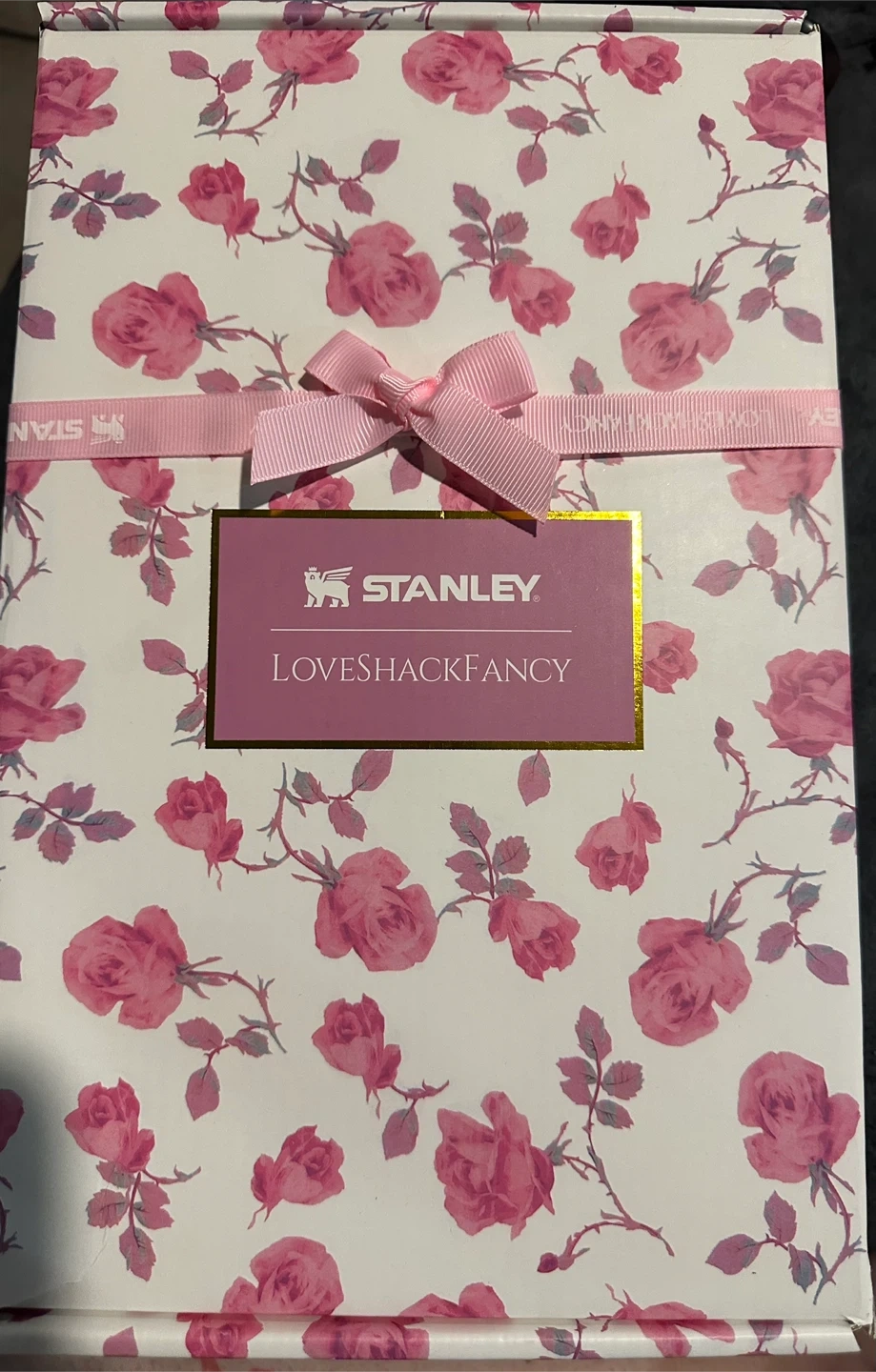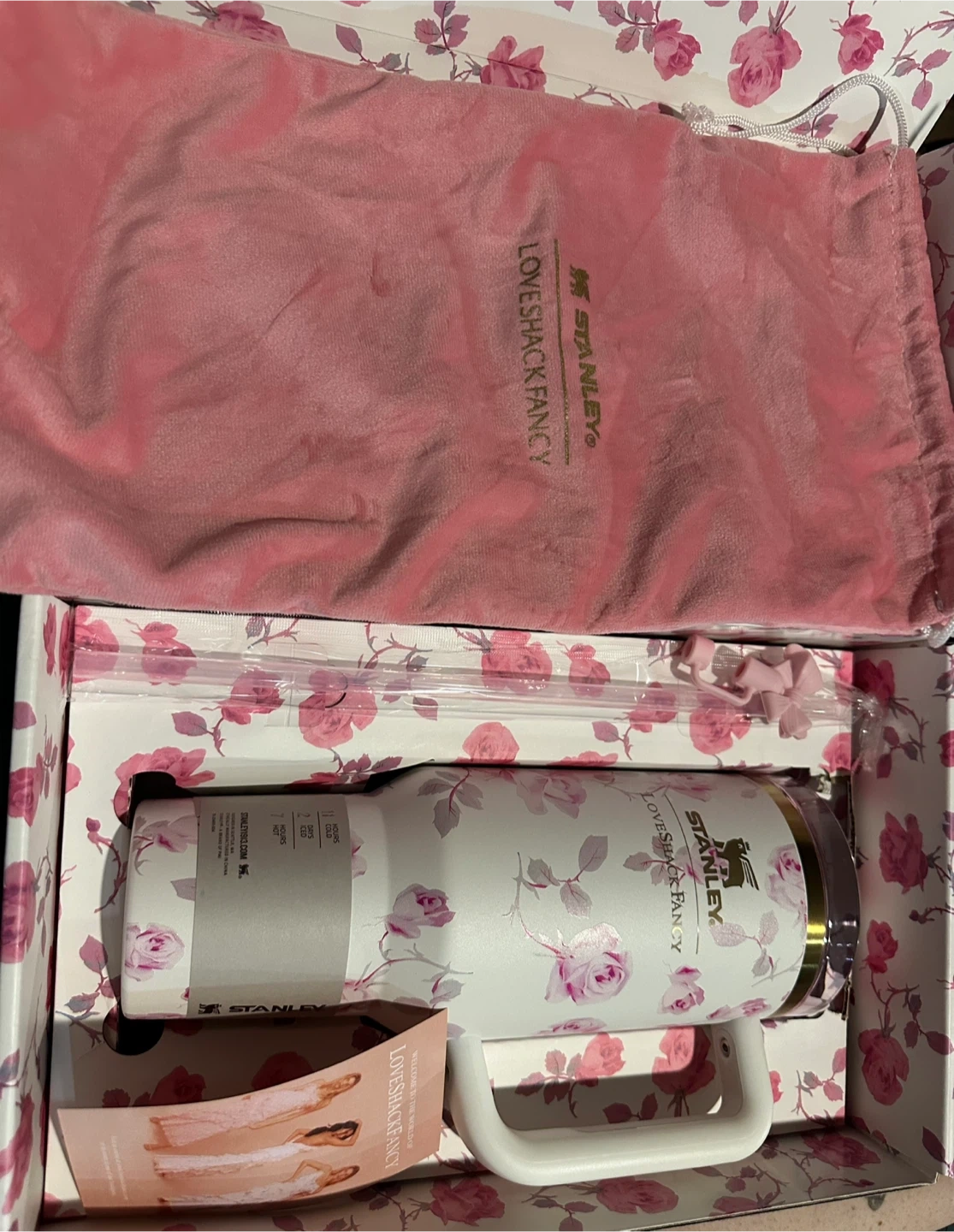 I have a brand new Stanley x LoveShackFancy Quencher H2.0 Flowstate Tumbler, 40 oz. It comes with the box and a carrying bag. This stylish tumbler is perfect for keeping your drinks cold or hot on the go!