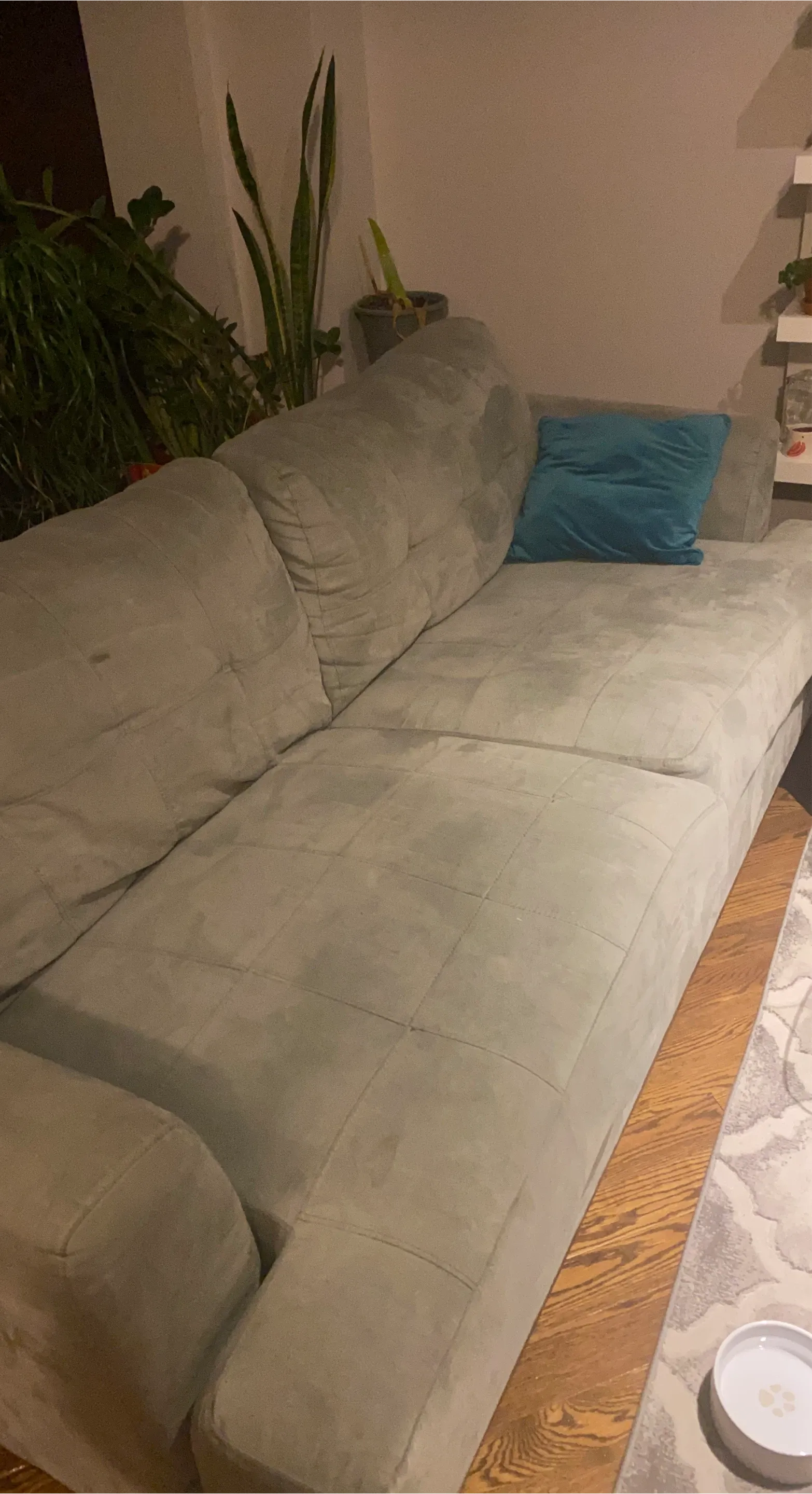 This is a comfortable grey sectional couch. It's upholstered in a soft, suede-like material with quilted detailing on the seat cushions. Includes one teal accent pillow.