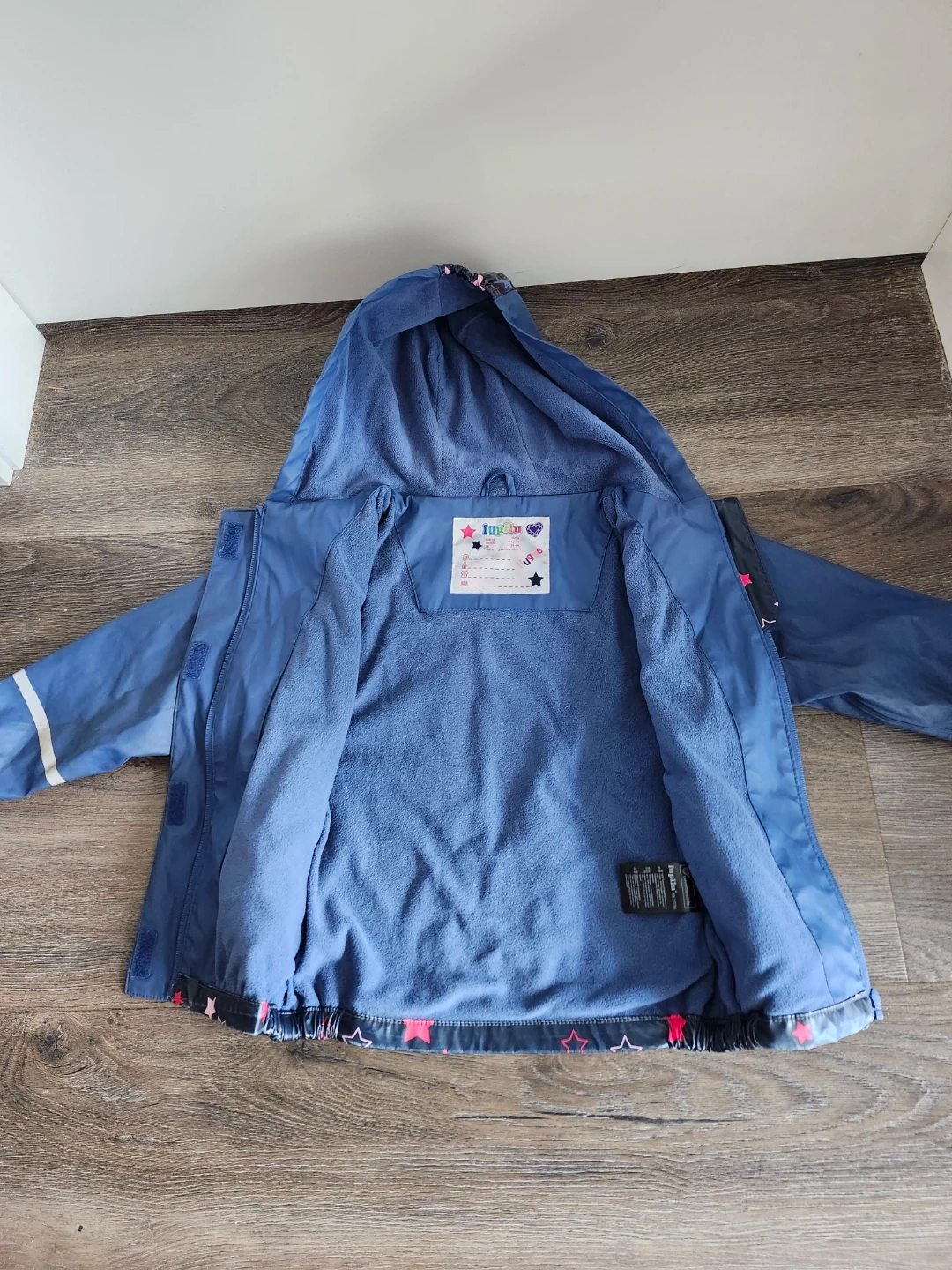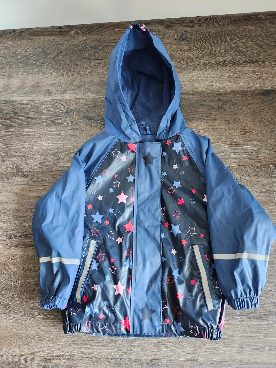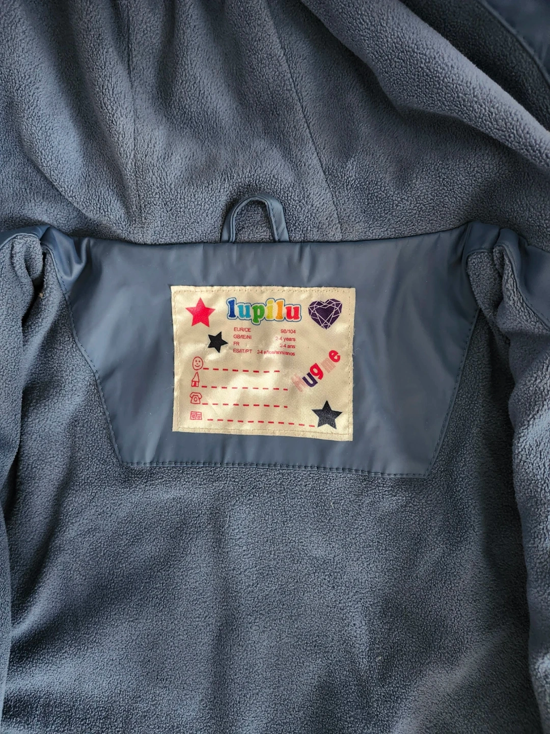 This Lupilu rain jacket is designed for little ones. It's blue with a fun star pattern and has reflective stripes on the sleeves and hem. The jacket is lined with fleece for extra warmth. It's great for keeping dry on rainy days!