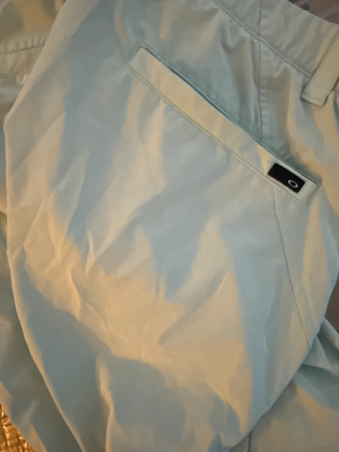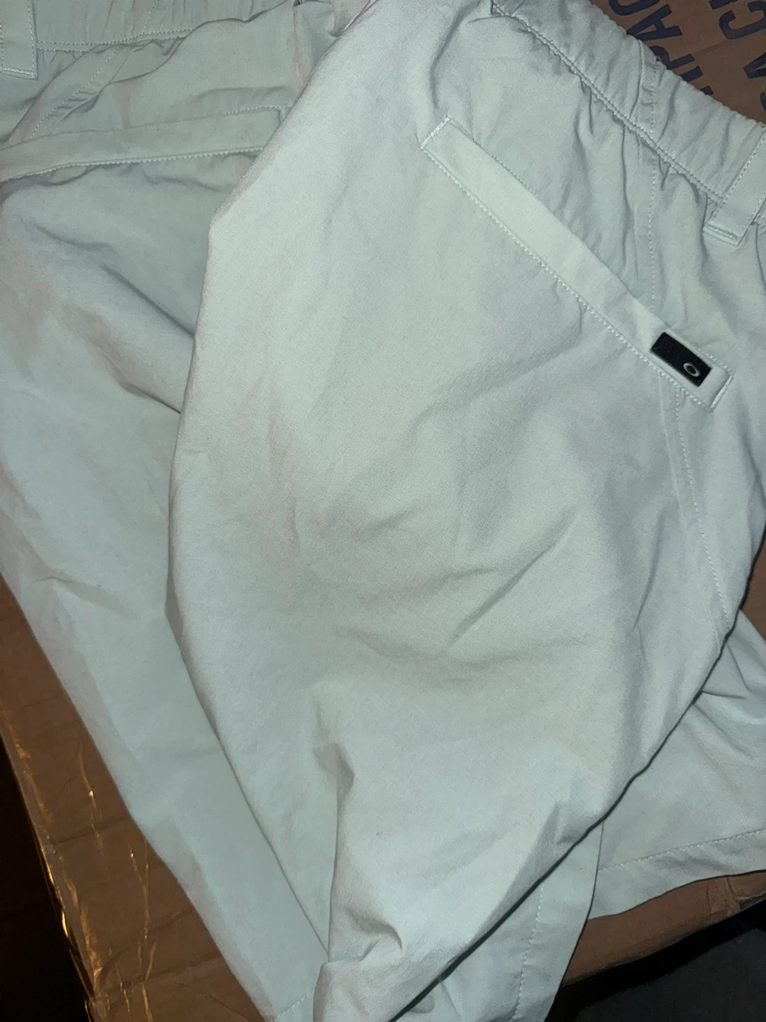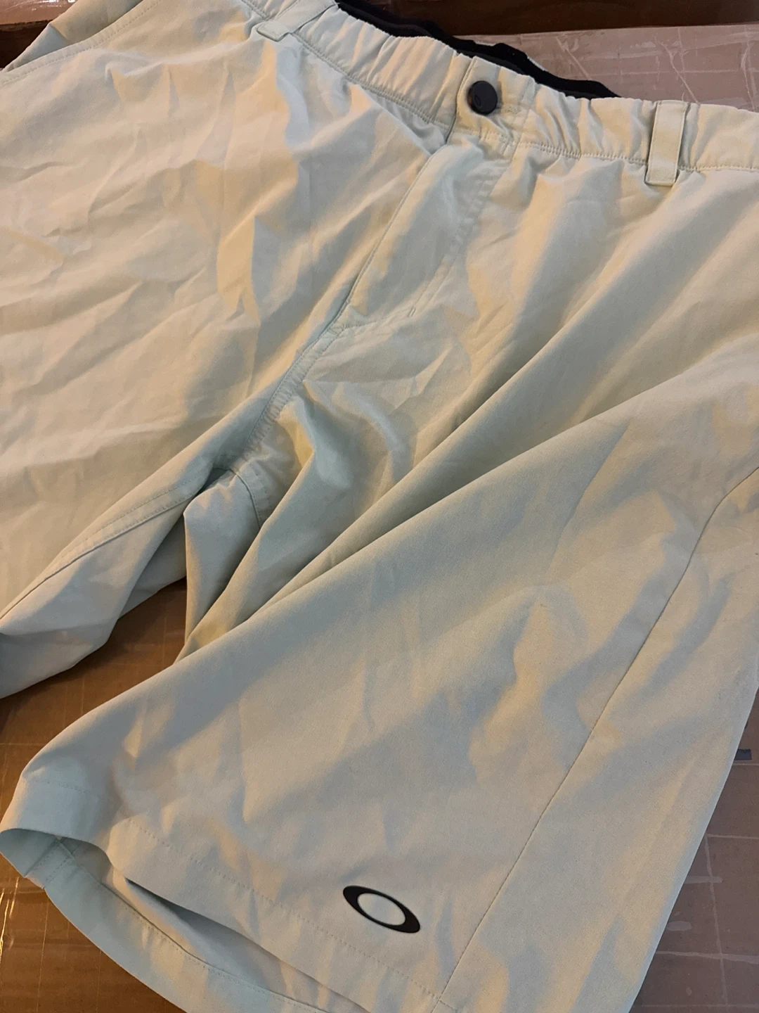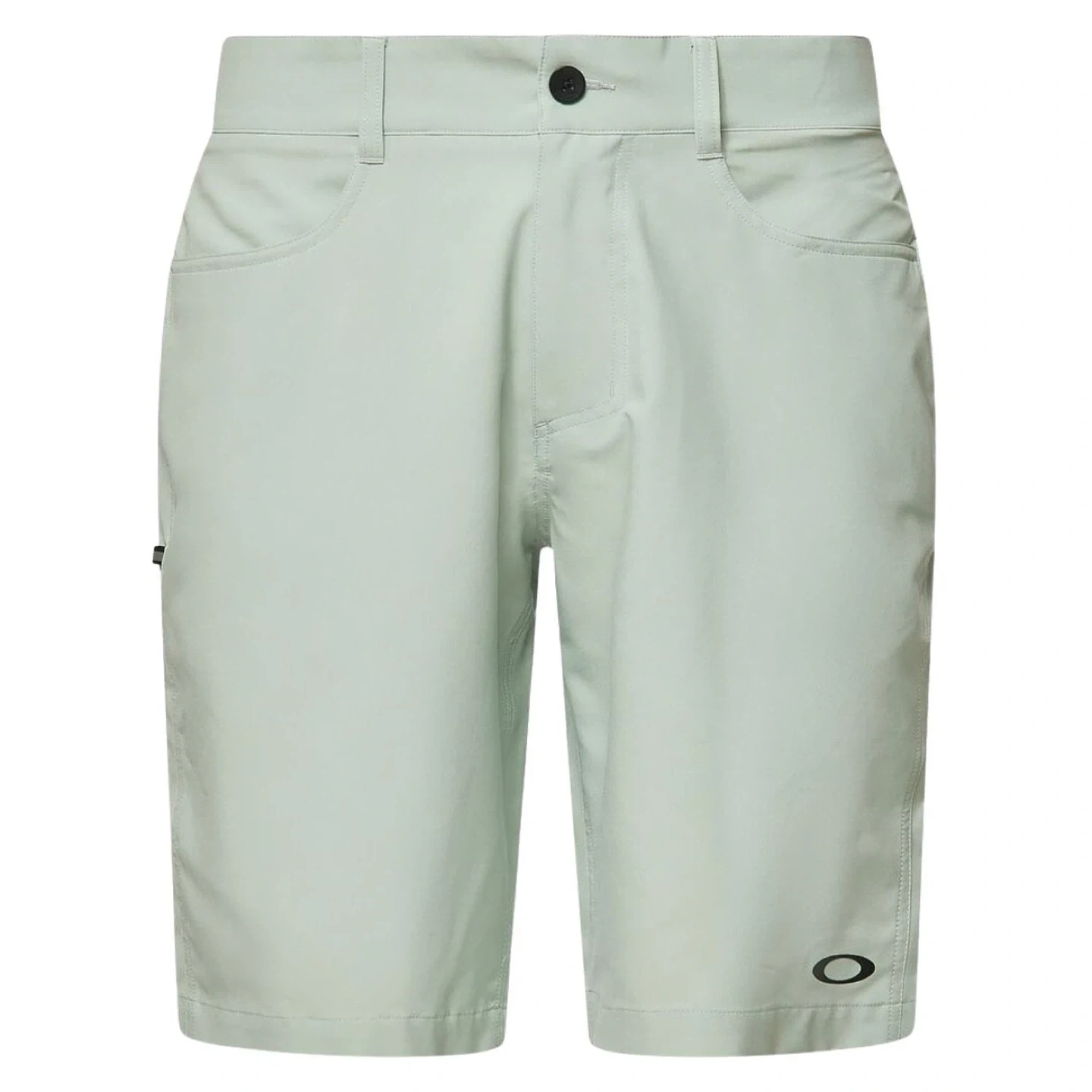 Oakley men's shorts in a light sage green colour. These shorts feature a button and zip closure, along with pockets. They're made from a lightweight fabric.