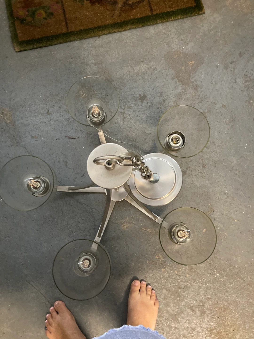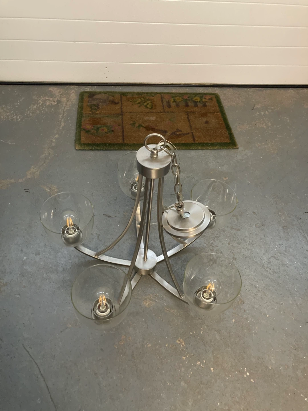 Selling a chandelier with five clear glass shades. It has a modern, minimalist design with a brushed metal finish. Perfect for adding a touch of elegance to any room!