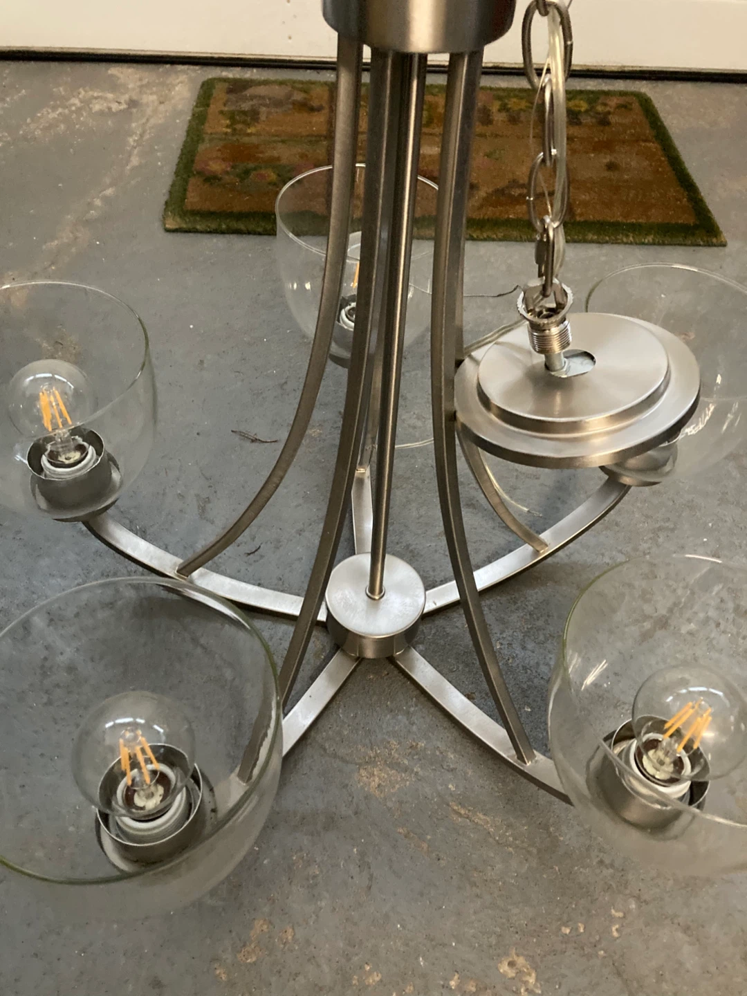 Selling a chandelier with five clear glass shades. It has a modern, minimalist design with a brushed metal finish. Perfect for adding a touch of elegance to any room!
