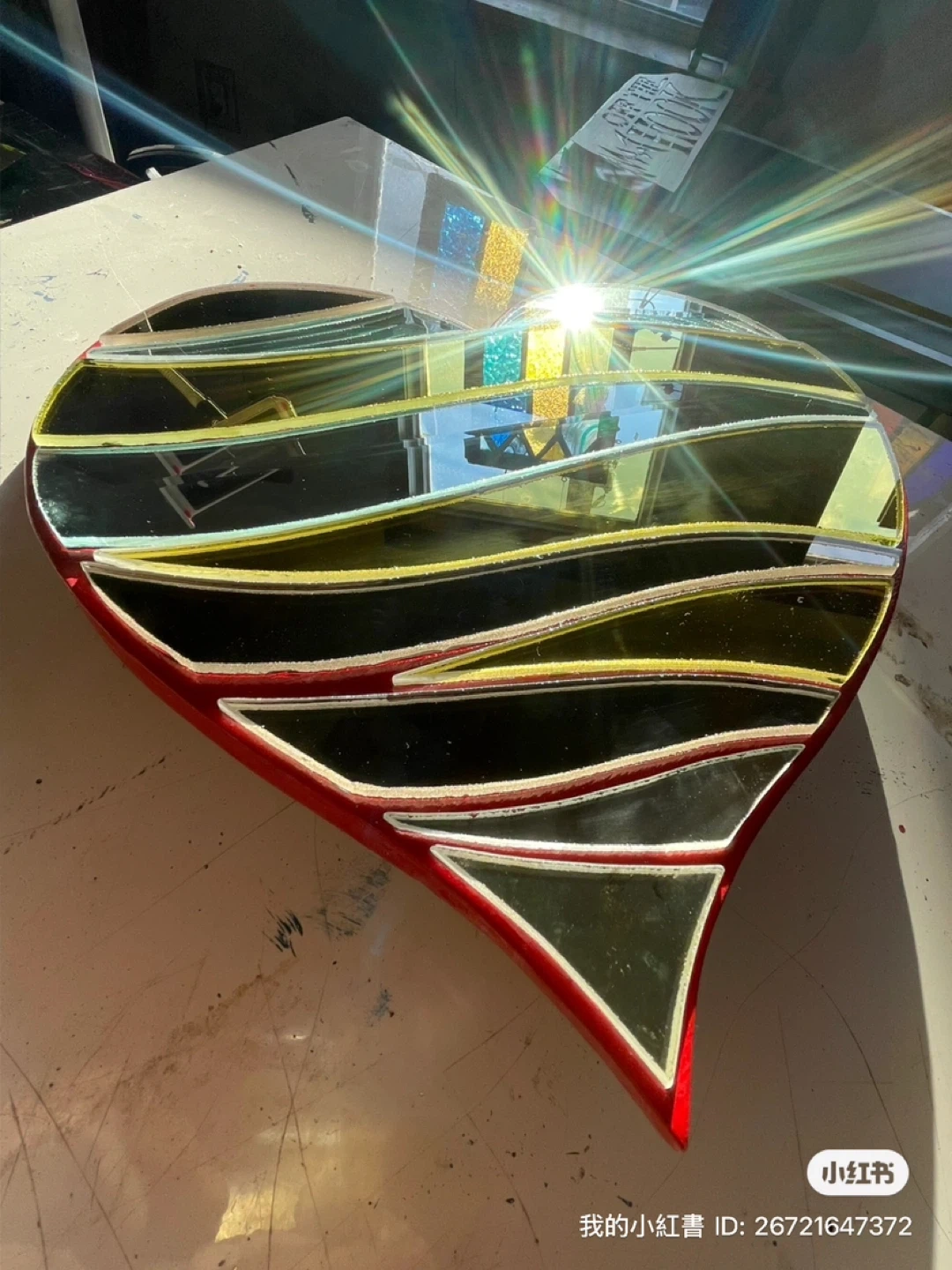 This unique mirror heart-shaped piece is made of multiple styles of mirror glass.