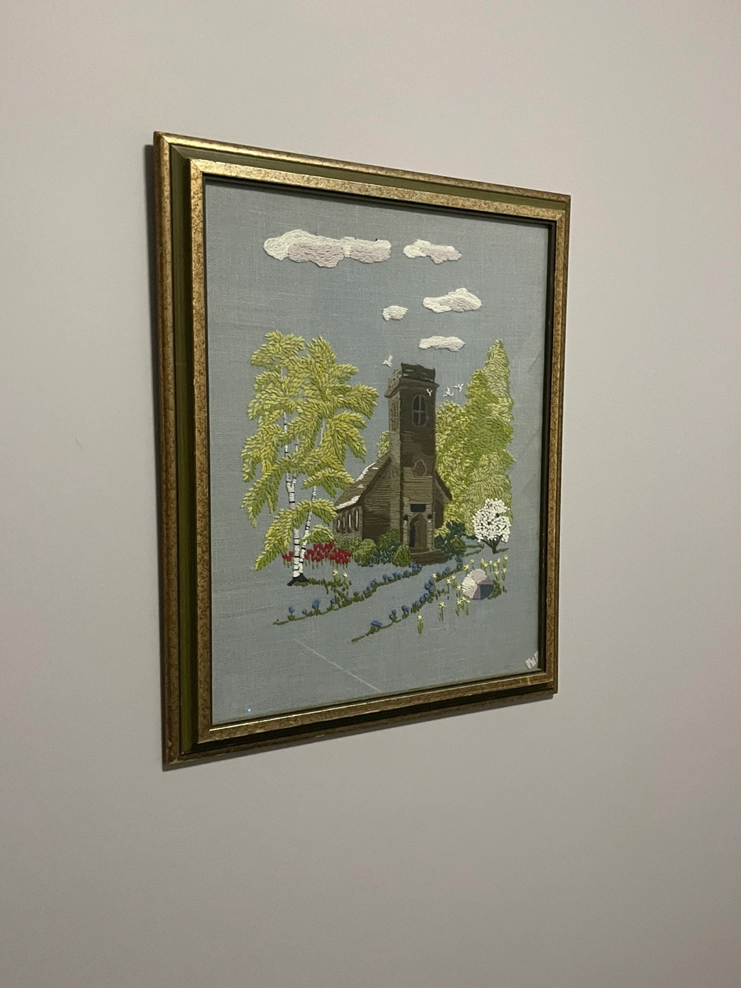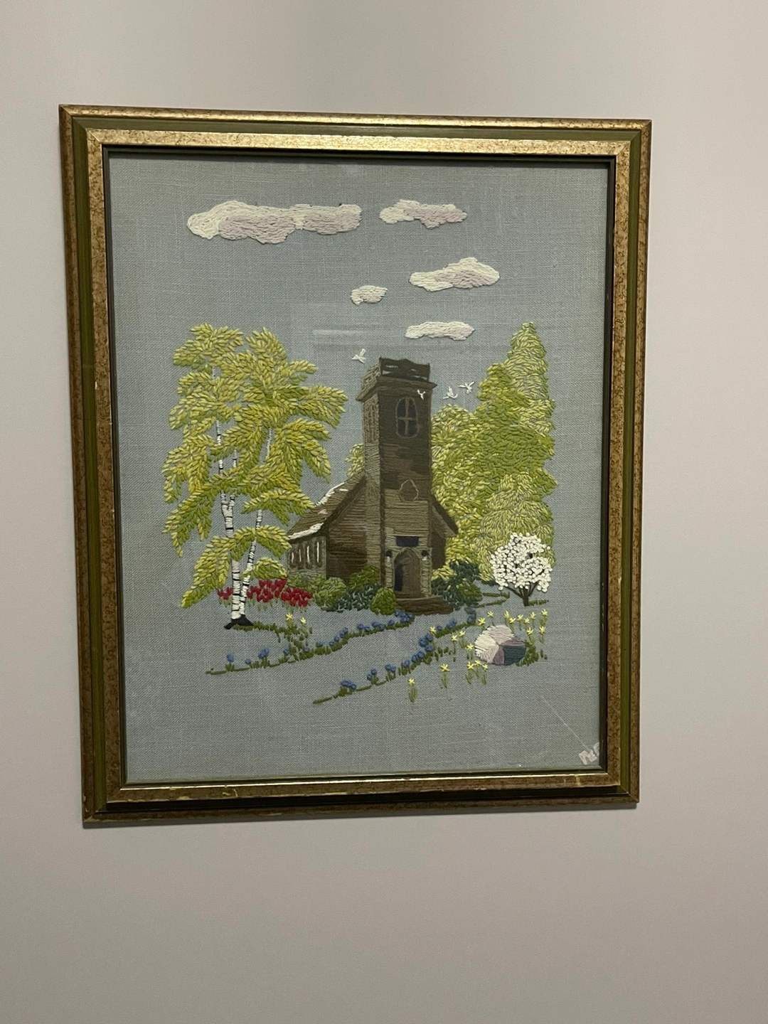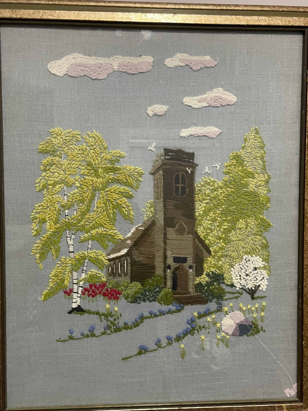 Framed needlepoint embroidery. Depicts a church surrounded by trees and flowers. Gold-toned frame shows some wear. Measures approximately 18” X 22”.