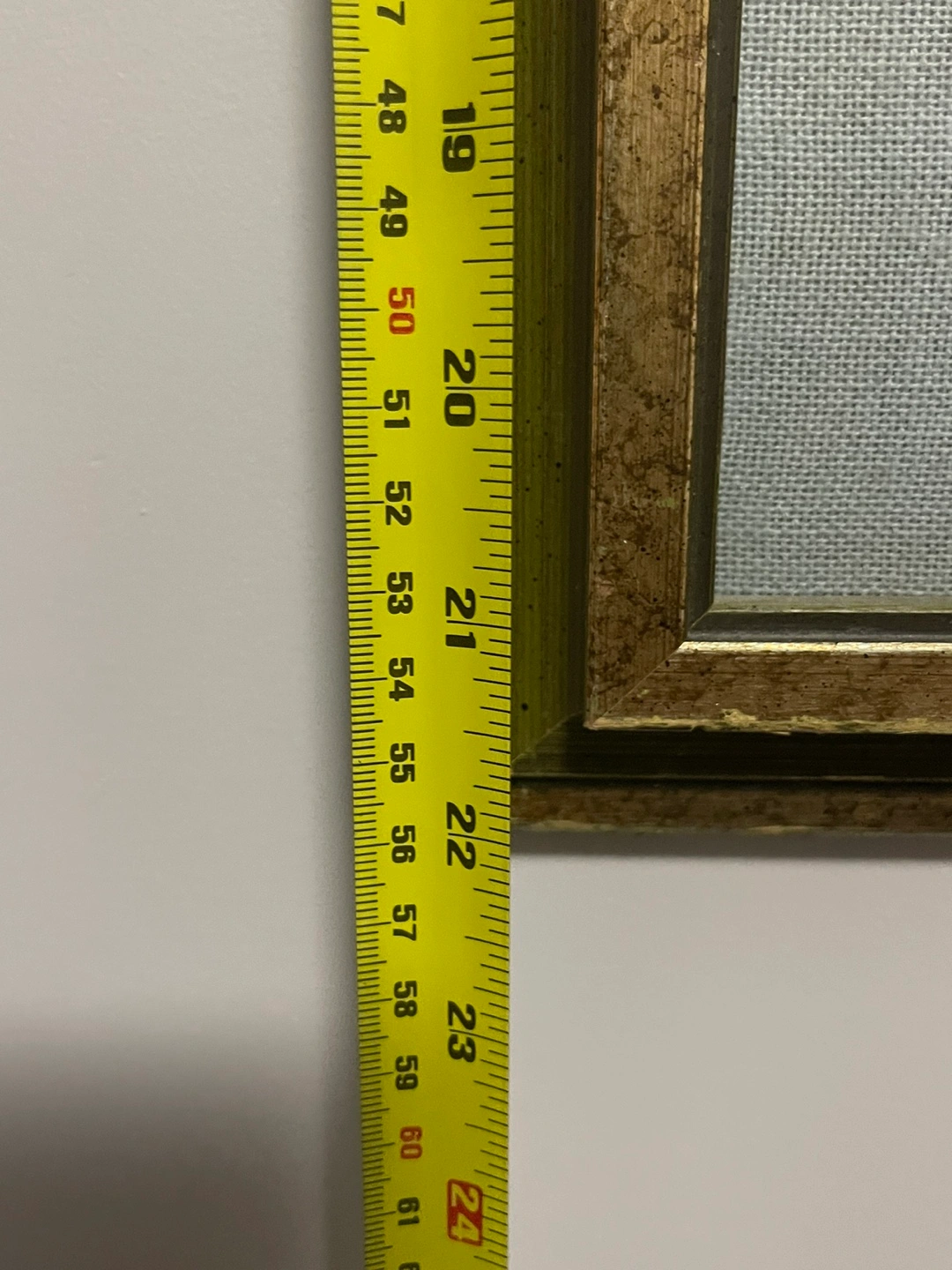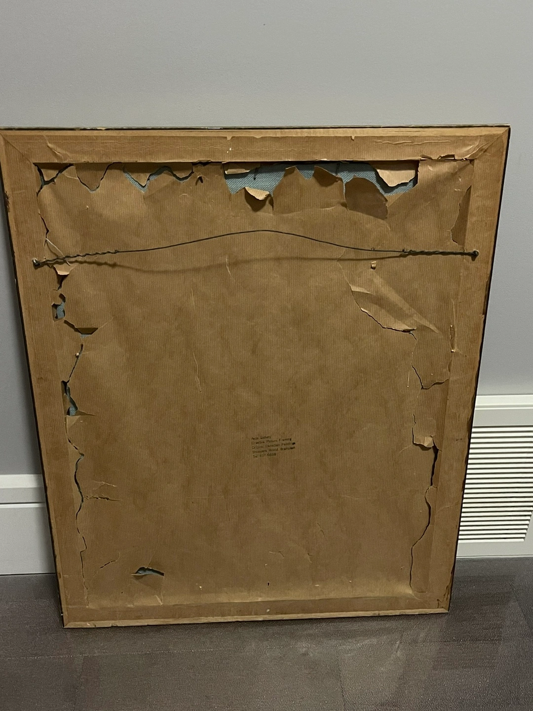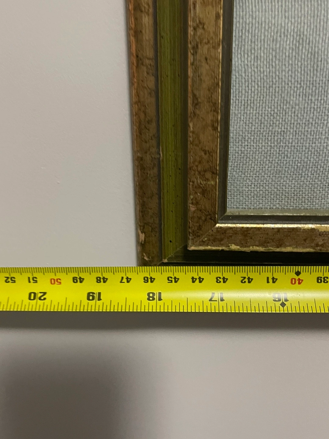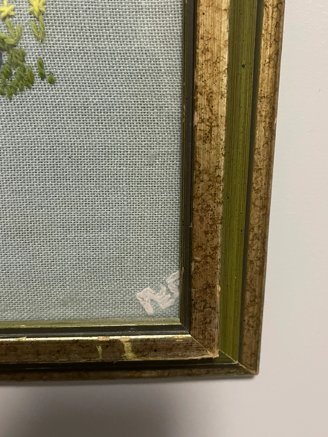 Framed needlepoint embroidery. Depicts a church surrounded by trees and flowers. Gold-toned frame shows some wear. Measures approximately 18” X 22”.