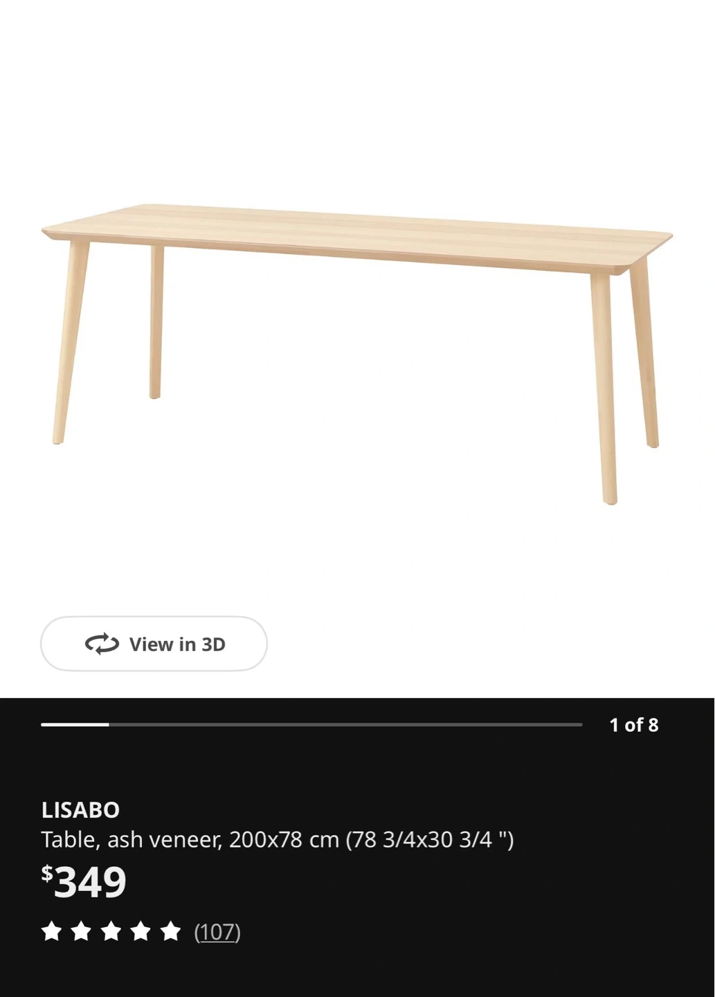 This is an Ikea Lisabo dining table. It's made of ash veneer and measures 200x78 cm (78 3/4x30 3/4 ") no damages mint condition