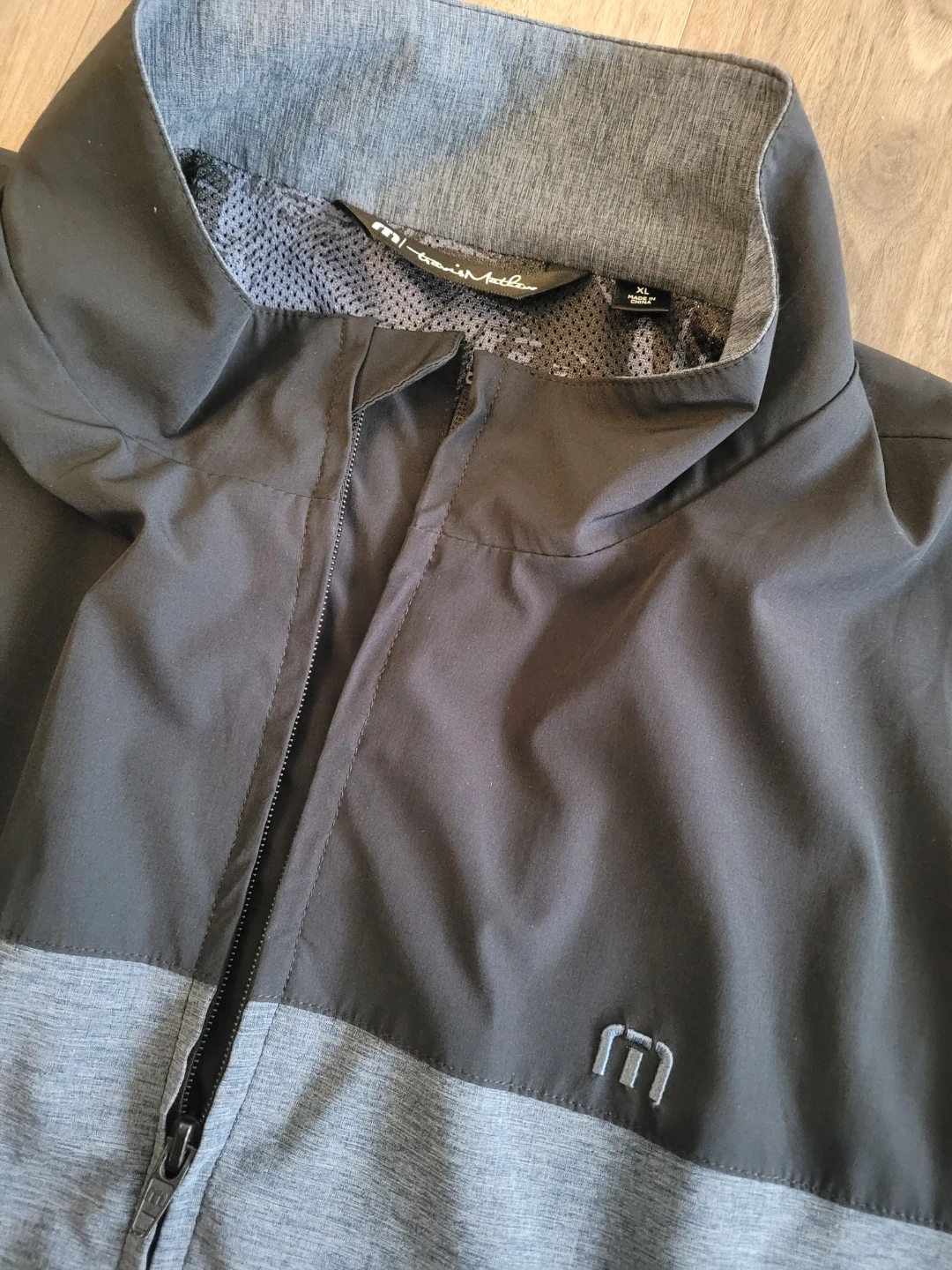Travis Mathew men's jacket in size XL. It's a full-zip style with a two-tone design. Great for golf or casual wear!