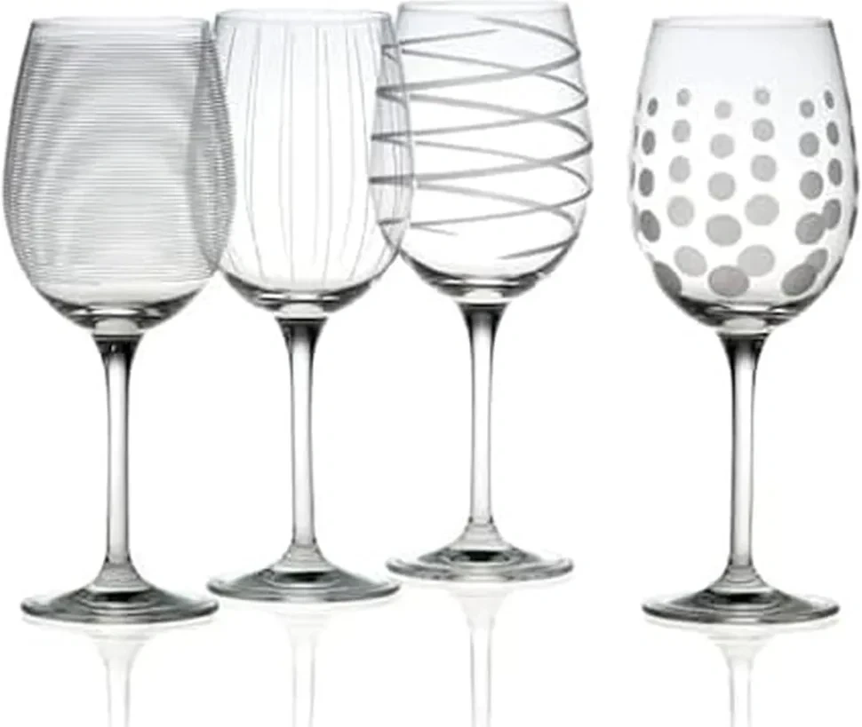 Mikasa set of four plus one extra wine glasses, each with a unique etched design. One features horizontal lines, another vertical lines, a third a swirled pattern, and the last a polka dot design. They're made of clear glass.