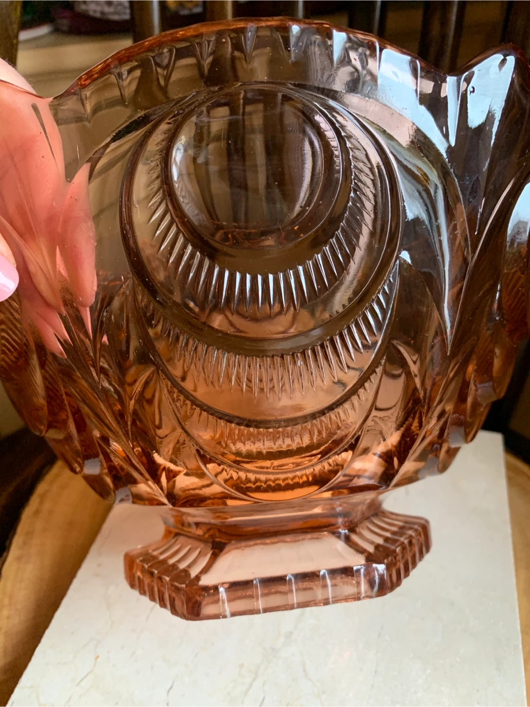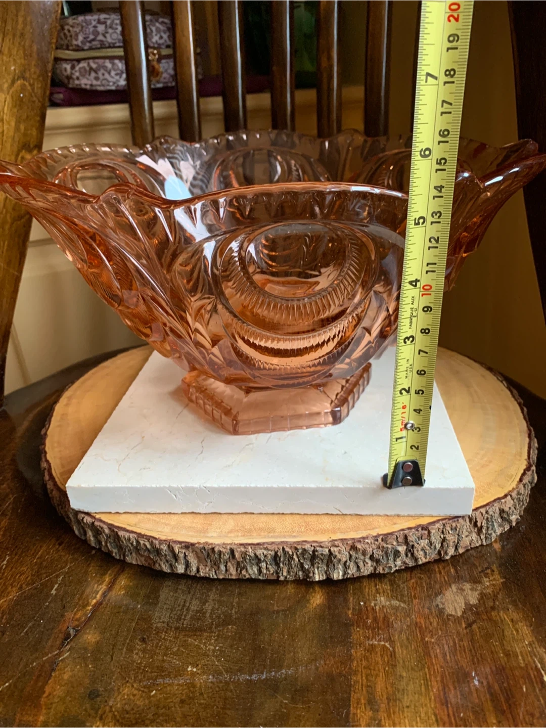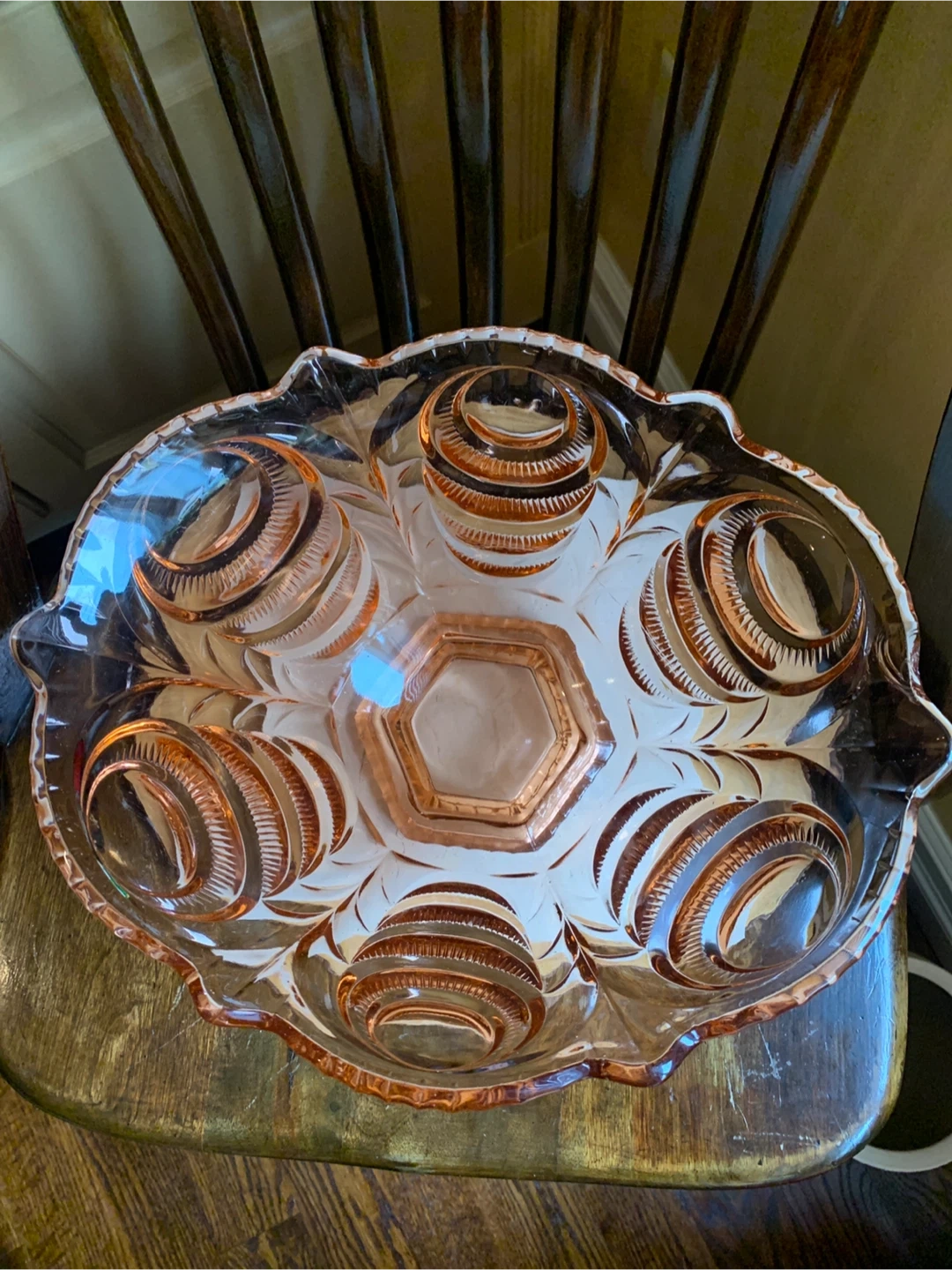 This is a a really special vintage 1930’s pretty pink depression glass serving bowl with intricate carved details. The pink glass may have been called Rosaline pink and it is pressed into these beautiful shapes. It most likely was produced in Belgium or Germany. It is very heavy and substantial with only one disclaimer of a manufacturing error and a small flea bite as seen in pics. It would make for a stunning centrepiece for any table or kitchen island. Originally used as a fruit bowl, but could really have a variety of uses. The diameter measures 11” and it is about 6” tall. This Art Deco stunner needs to shine in someone’s home!