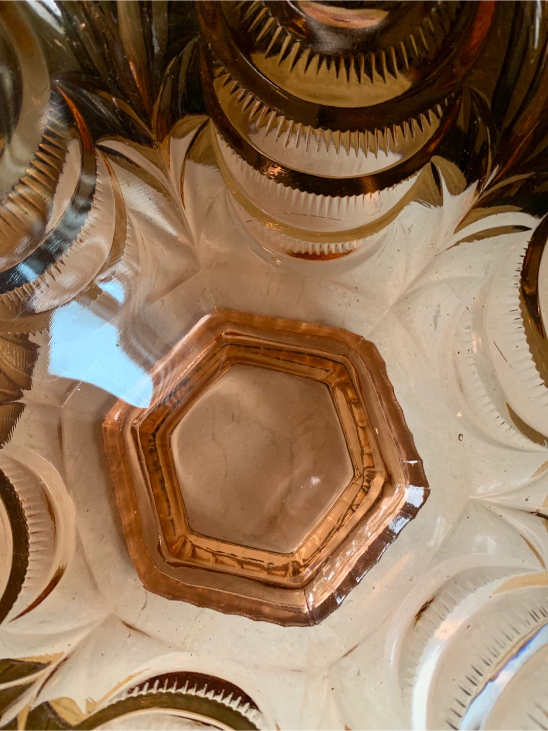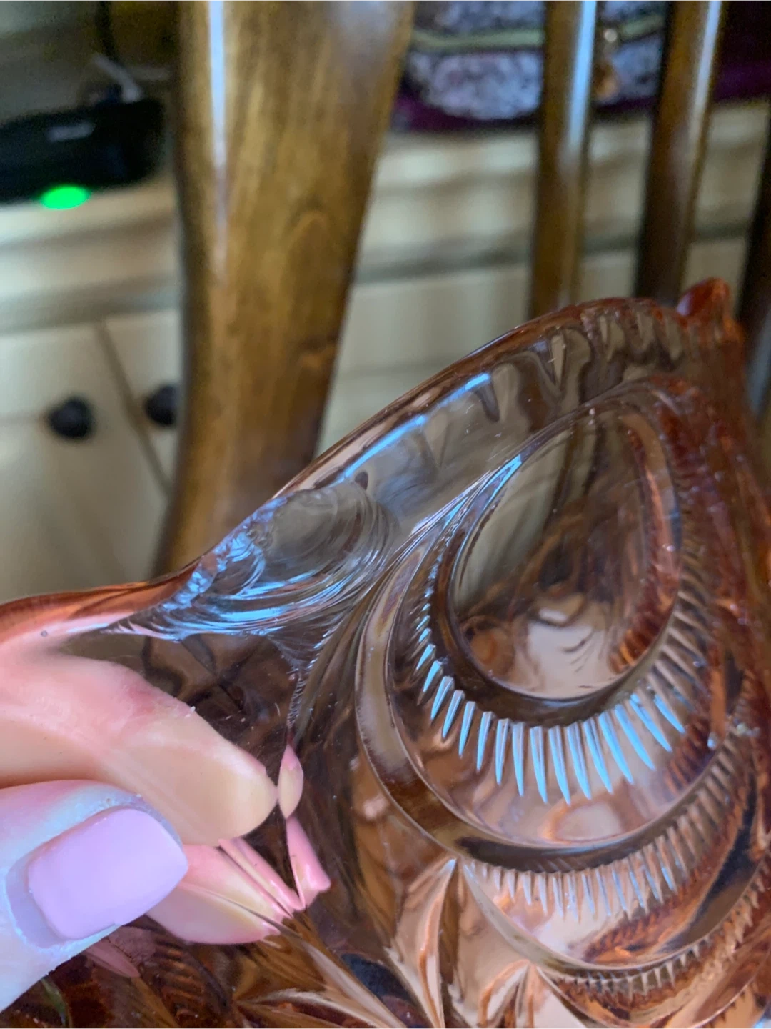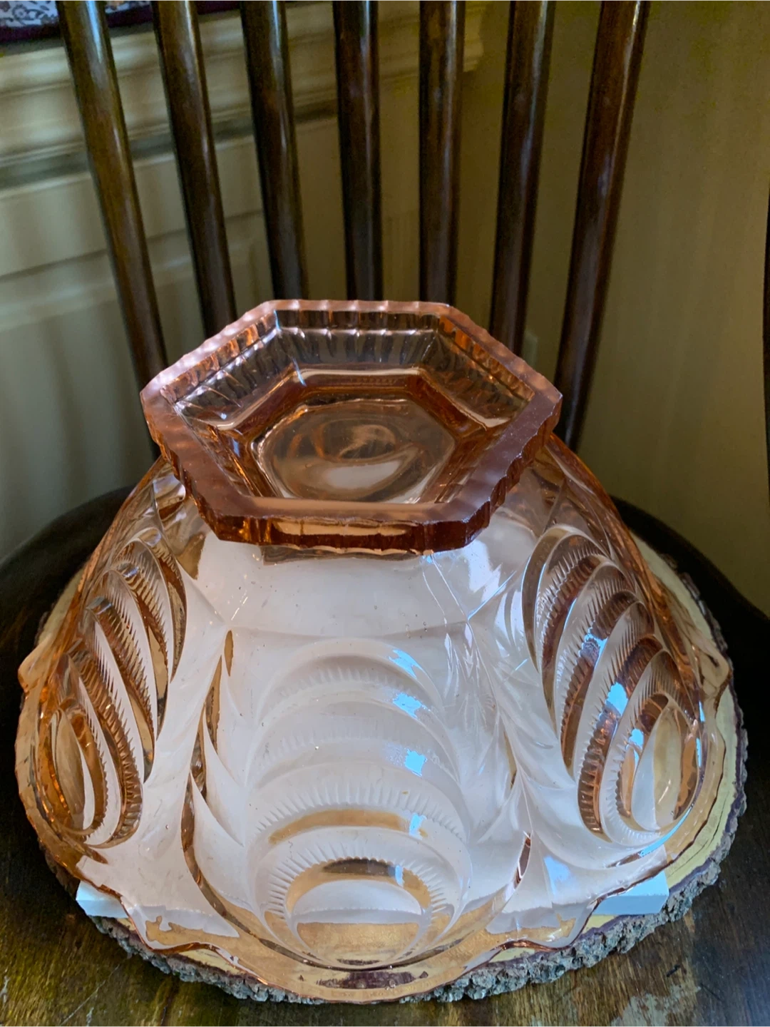 This is a a really special vintage 1930’s pretty pink depression glass serving bowl with intricate carved details. The pink glass may have been called Rosaline pink and it is pressed into these beautiful shapes. It most likely was produced in Belgium or Germany. It is very heavy and substantial with only one disclaimer of a manufacturing error and a small flea bite as seen in pics. It would make for a stunning centrepiece for any table or kitchen island. Originally used as a fruit bowl, but could really have a variety of uses. The diameter measures 11” and it is about 6” tall. This Art Deco stunner needs to shine in someone’s home!