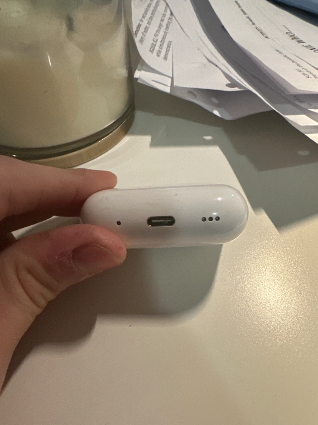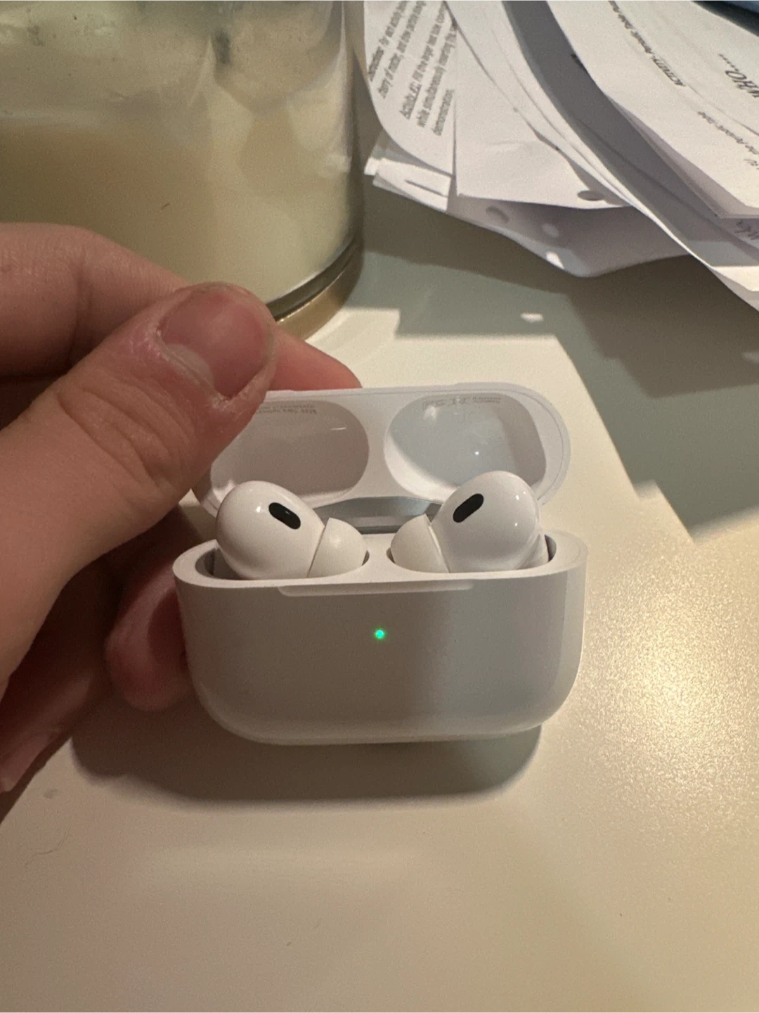 These are Apple AirPods Pro (2nd generation). They're white and come with their original charging case. The case features a USB-C charging port. This set is great for listening to music or taking calls on the go!