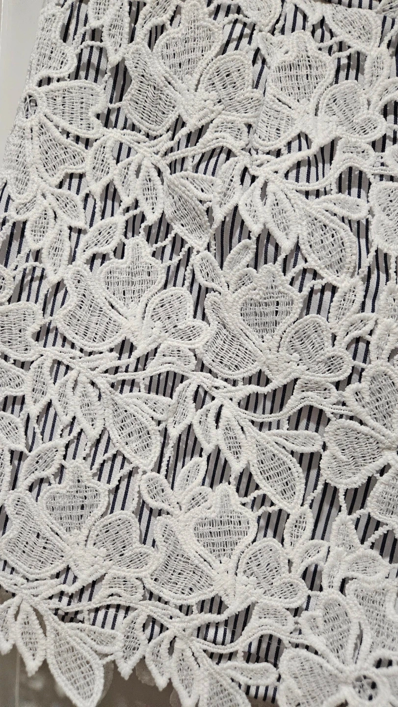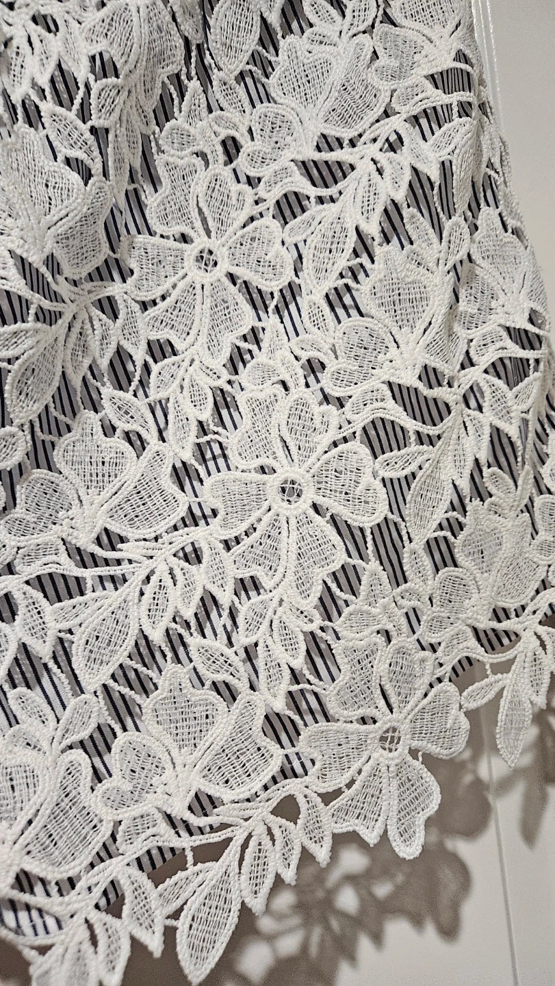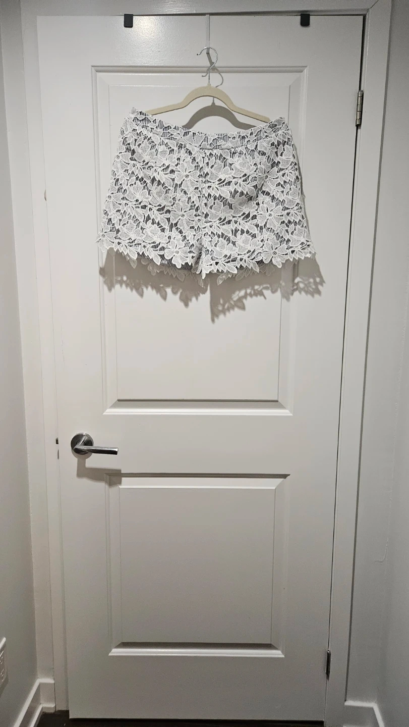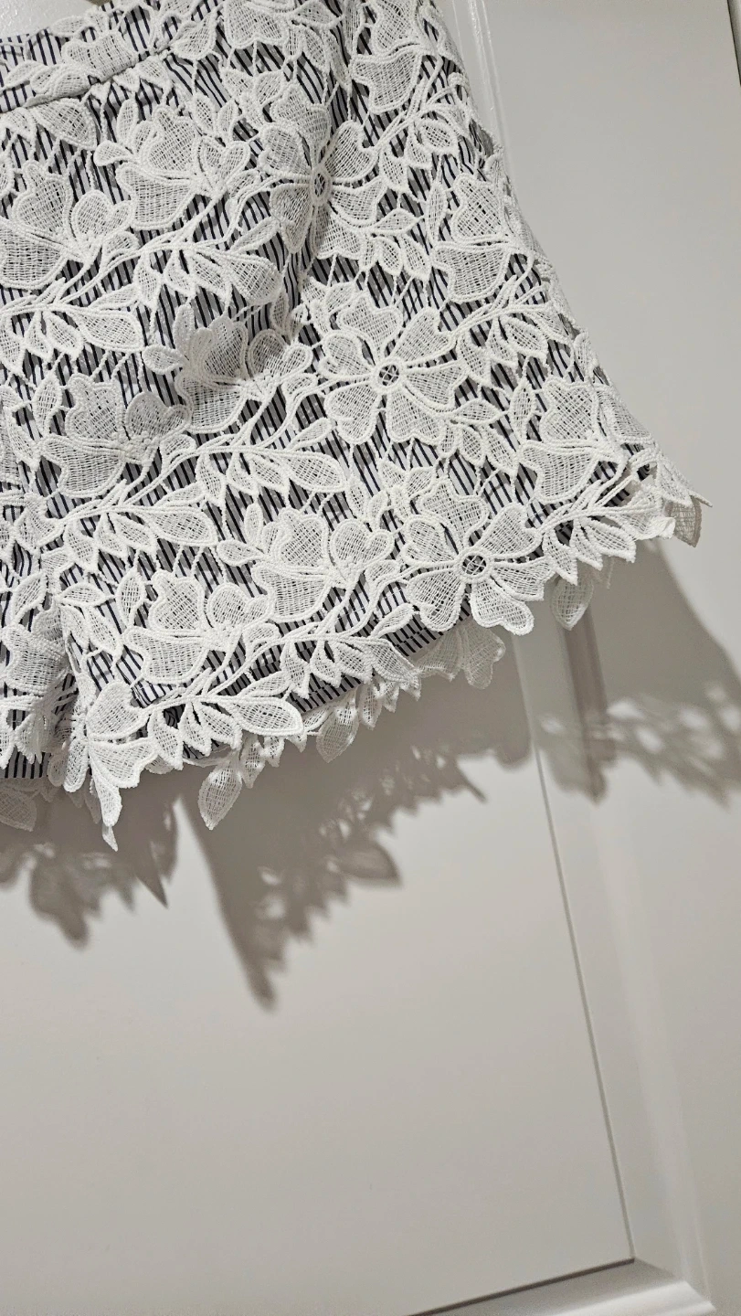ADIVA shorts with a white lace overlay on a navy and white striped fabric. These are a size medium.