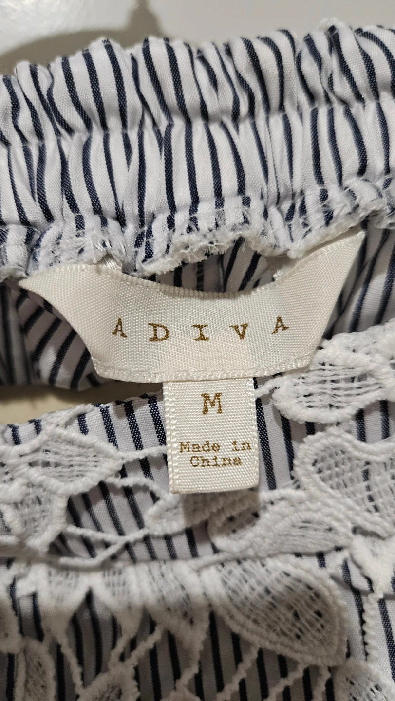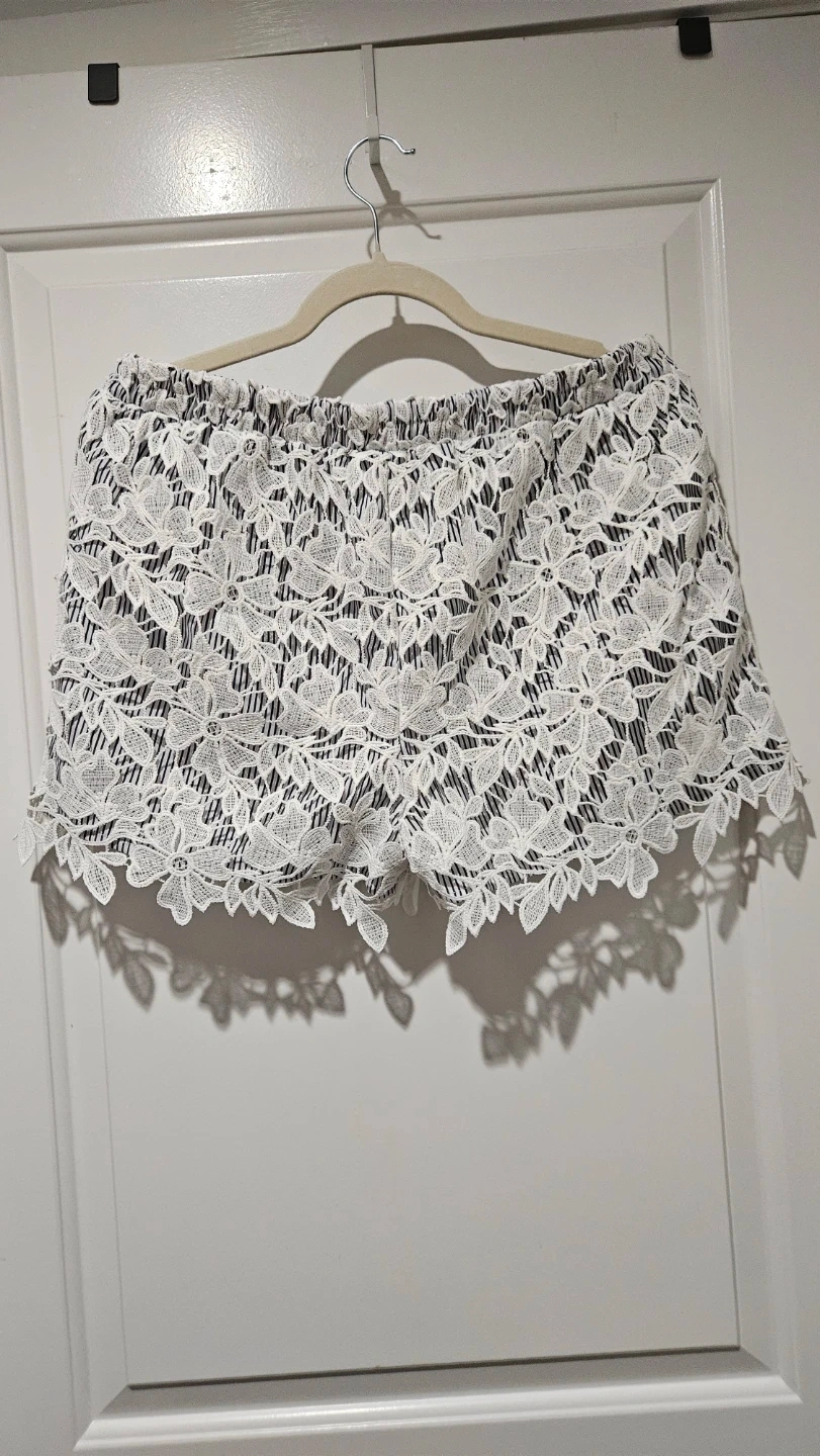 ADIVA shorts with a white lace overlay on a navy and white striped fabric. These are a size medium.