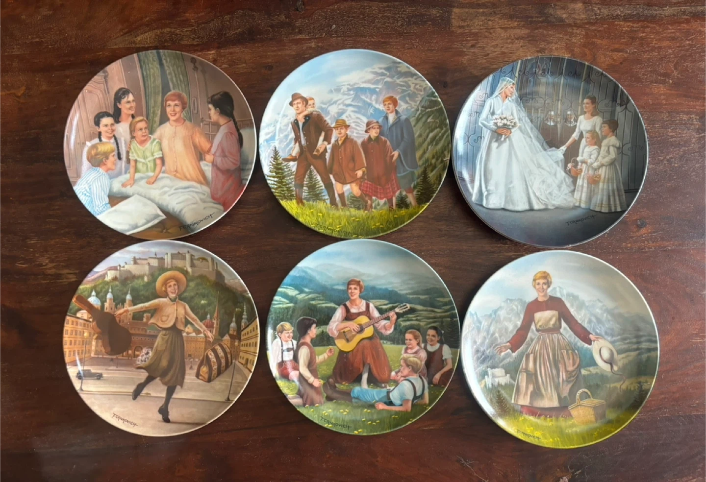 Set of 6 decorative collector's plates inspired by the film The Sound of Music. Each plate showcases a scene and characters from the beloved musical. They feature artwork by Tomislav Tomic, as signed on each plate. These plates are perfect for any fan of the movie or decorative plate collectors.
