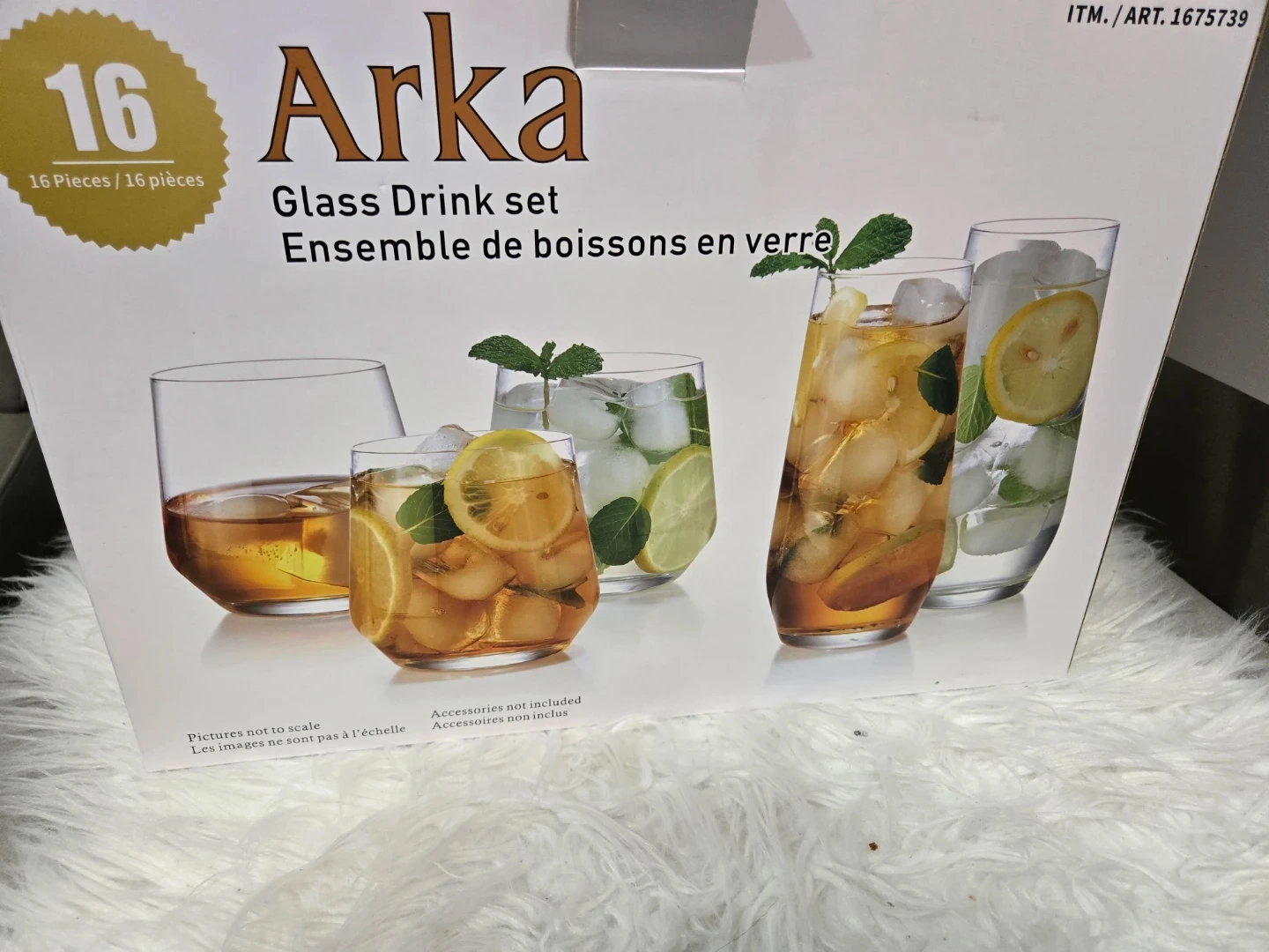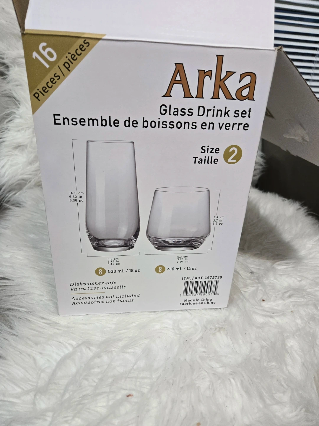Selling a brand new Arka glass drink set, still in its original box! This set includes 16 pieces, perfect for entertaining or everyday use. The set contains two sizes of glasses: 8 (4-4)glasses are 530 mL / 18 oz and 8 glasses are 410 mL / 14 oz
